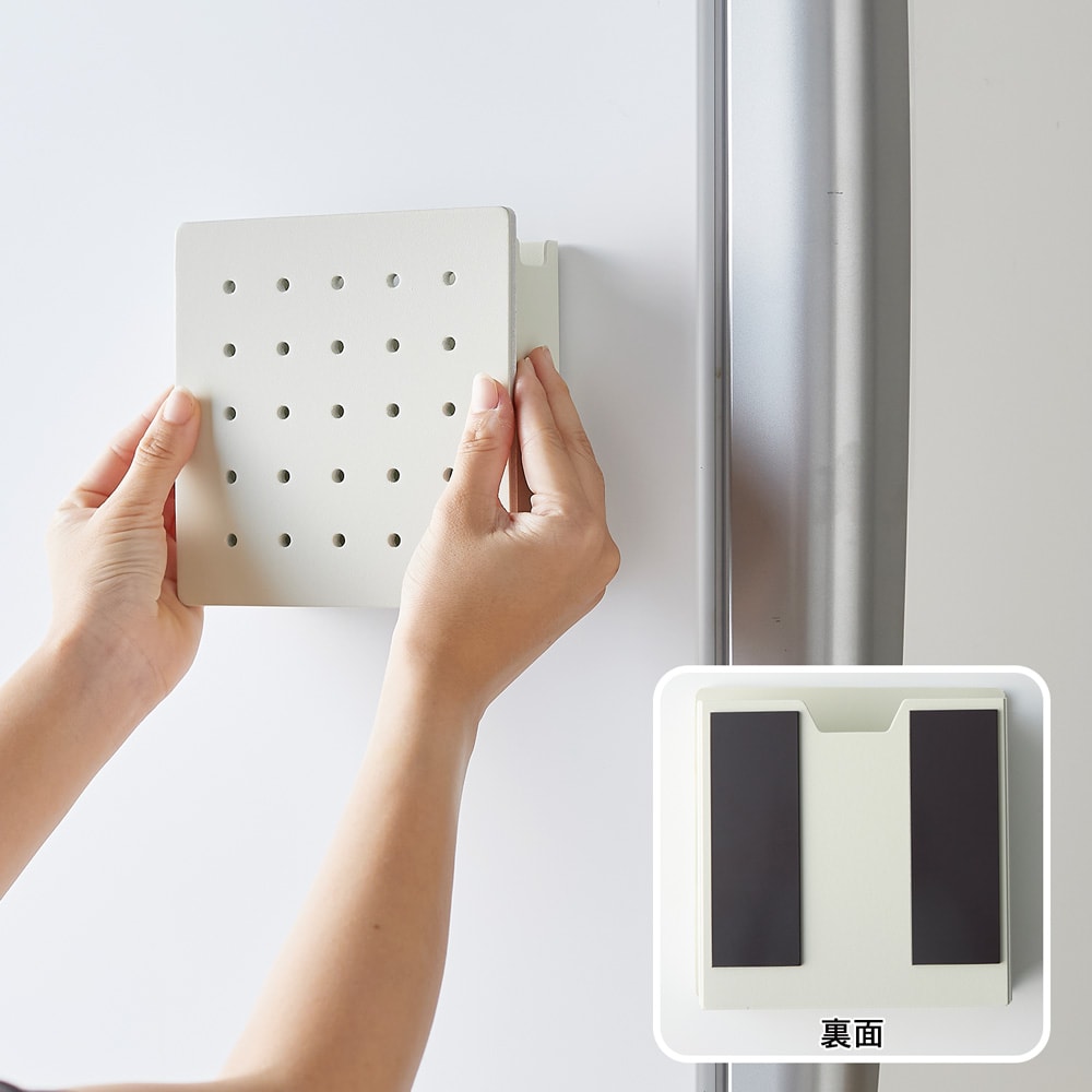 ●本体裏にはマグネットが付いているので、金属面に貼るだけで簡単に設置ができますネジ留めがいらず、工具無しで取り付けられるので、取り外しや場所の移動も簡単です玄関扉や冷蔵庫など、ご家庭内での使用をはじめ、オフィスのロッカーやキャビネット、金属製のパーティションなどに貼り付けてお使い頂けます