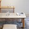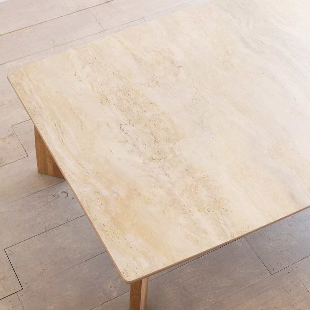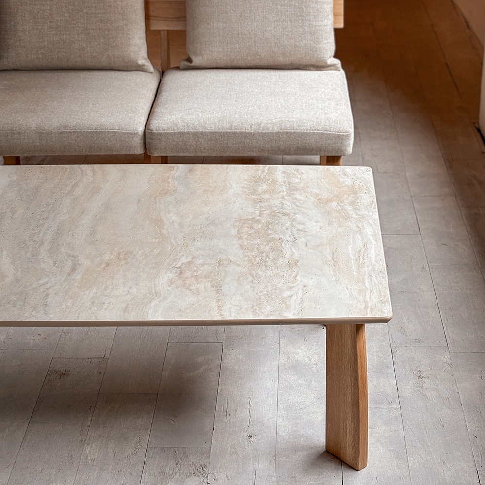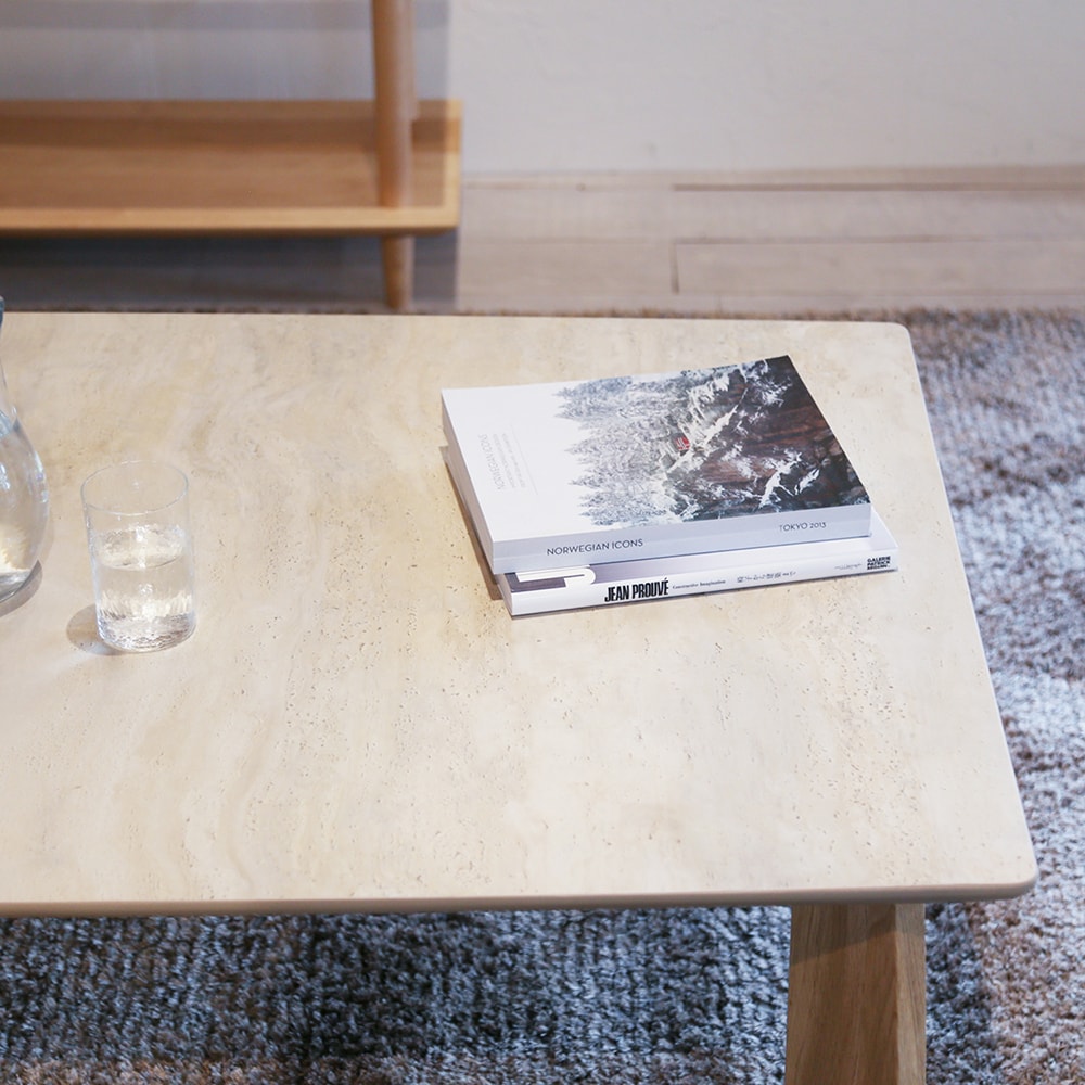 大理石調の淡い色合いの天板は長辺にゆるやかなカーブを付けた天板形状