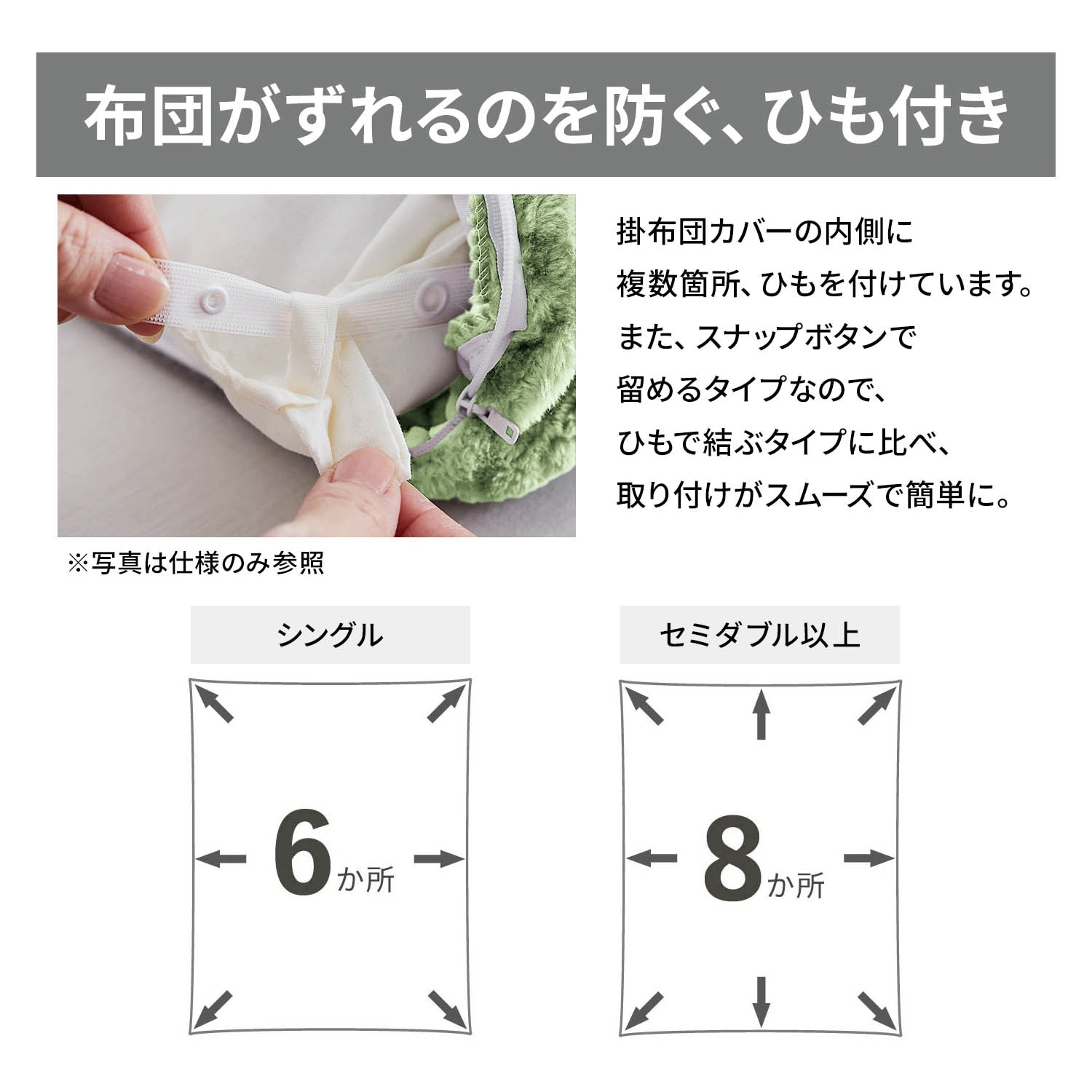 ●掛け布団カバーはスナップボタン式ずれ防止ひも付き、スリット仕様