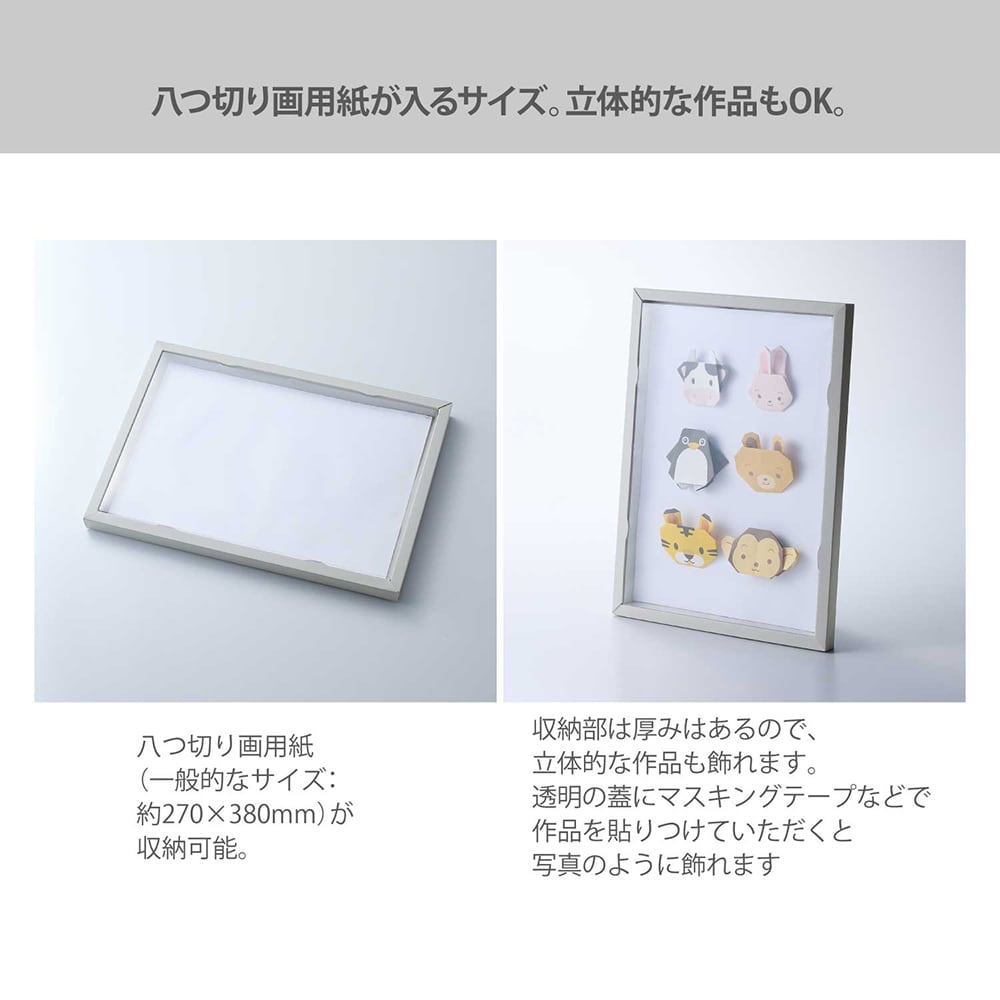 ●八つ切り画用紙の作品を最大25枚まで収納できる箱型フレームです。