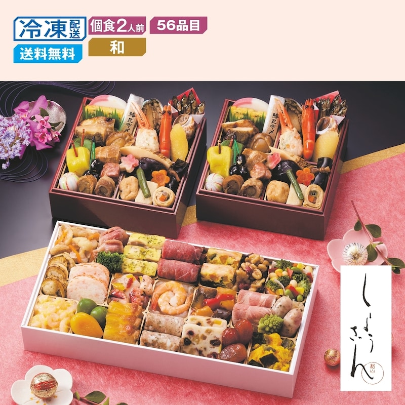 ●2人前●56品目●お重サイズ/31.3×15.6×4.6cm(オードブル)、15.6×15.6×4.6cm(おせち一段)●賞味期限/冷凍で2026年1月31日●特定原材料/卵・乳成分・小麦・えび・かに・くるみ●国内製造