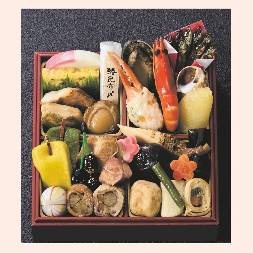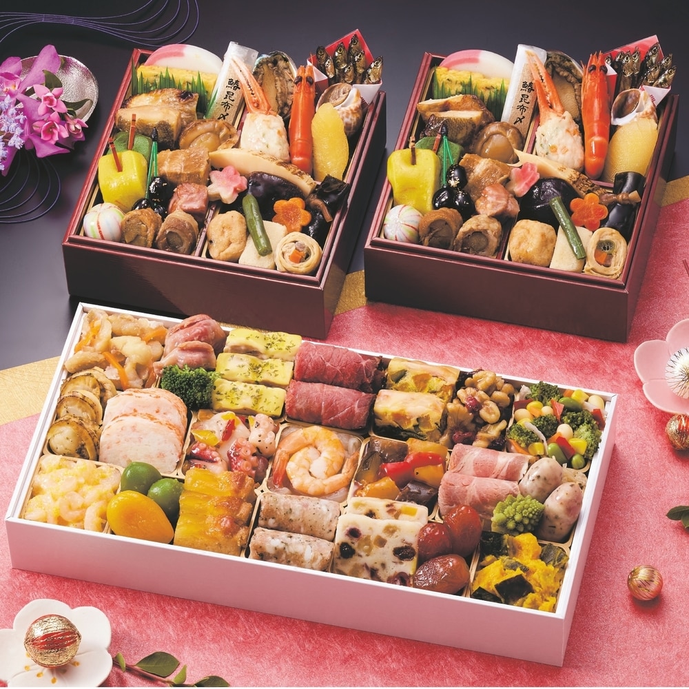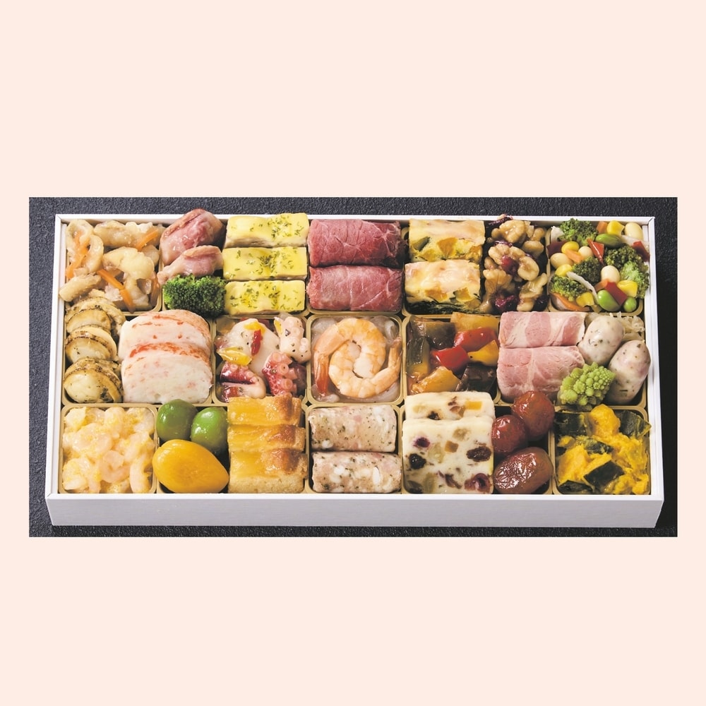 ●お品書き/【和の個食重】紅白蒲鉾、九条葱入り玉子焼、赤魚西京焼、黄金カレイ柚庵焼、鰆昆布〆金箔紙包み、焼帆立、あわび煮、磯わかめ、田作り煮、味付バイ貝、紅ズワイ蟹爪団子、海老の旨煮、味付数の子、松前漬、蓬麩含め煮、粟麩含め煮、手まり餅、梅麩含め煮、豚角煮、黒豆金箔松葉串、合鴨スモーク、牛肉八幡巻、穴子八幡巻、味付焼筍、椎茸旨煮、ひろうすとインゲンの煮付、味付高野豆腐、梅人参含め煮、にしん昆布巻、湯葉三色巻【洋のオードブル重】イトヨリのエスカベッシュ、砂肝コンフィ、ブロッコリーコンソメ味、鶏チーズ焼、ローストビーフトリュフソース掛け、野菜のキッシュ、クランベリーくるみ、ブロッコリーとお豆のサラダ、帆立バジル焼、シーフードテリーヌ、たこのバジルソース、スモークシュリンプ、オニオンマリネ、ラタトゥイユ、ローストポーク、ロマネスココンソメ味、ブータンブラン、シュークルート、海老マヨネーズサラダ、若桃コンポート、杏子コンポート、リンゴタルト、バジルソーセージ、ドライフルーツのチーズテリーヌ、ドライトマト赤ワイン煮、パンプキンサラダ