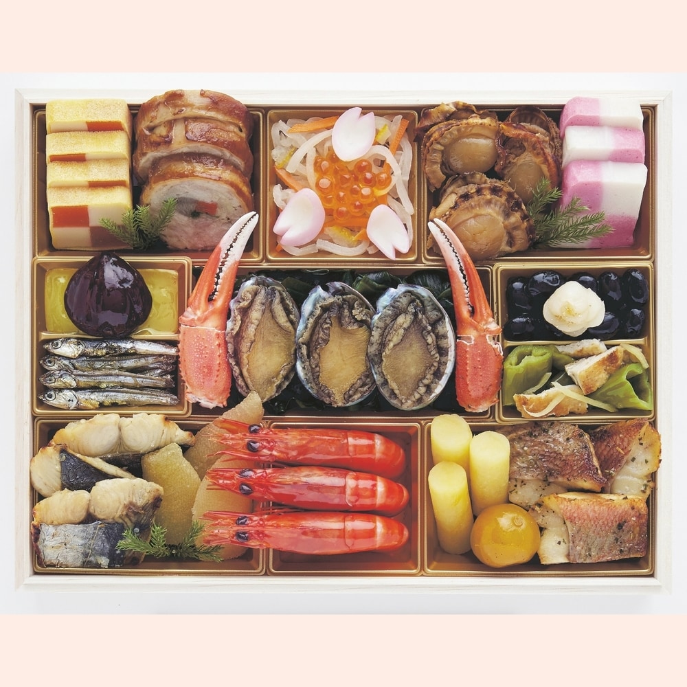 す、焼帆立、紅白市松蒲鉾、渋皮栗甘露煮、きんとん、田作り煮、紅ズワイ蟹爪、あわ