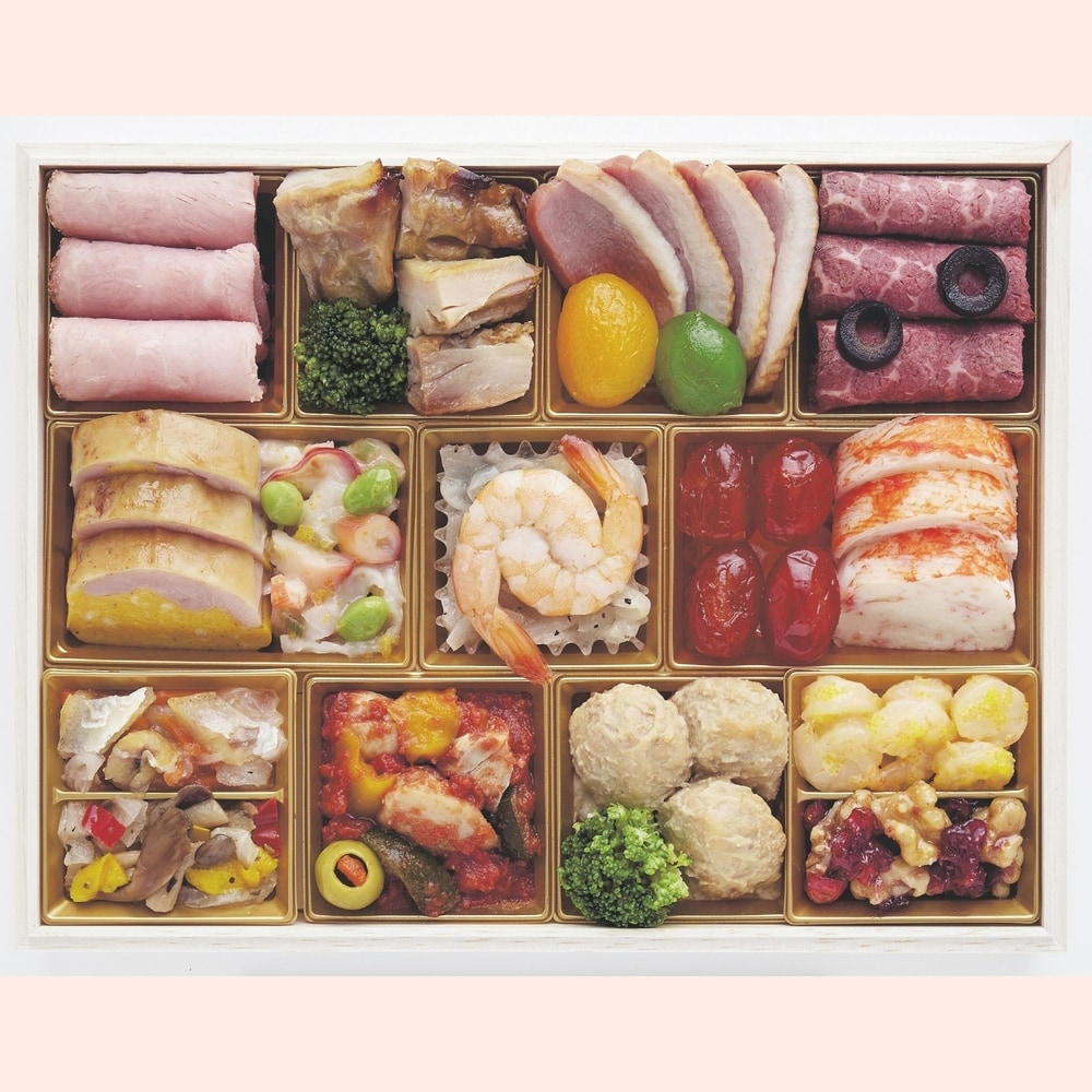 ローストビーフやペッパーボンレスハム、米麹を使ってしっとりと焼き上げトリュフオイルで香りづけした鶏肉などの肉料理を中心に、クリーミーなかぼちゃと辛子を効かせたチキンの組み合わせが絶妙なテリーヌ、ポルチーニ茸のソースを絡めた肉団子などワインのおつまみにぴったりのメニューや、チキンと野菜のトマト煮込みやマヨネーズ風味の小海老などお子様にもおすすめのメニューを豊富に22品詰め合わせました。