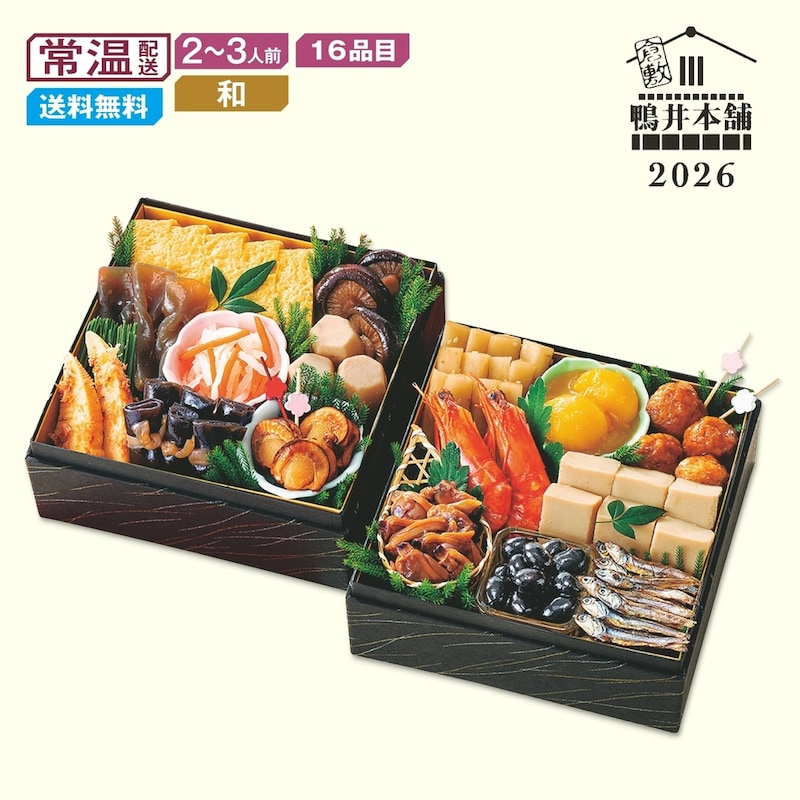 ●2~3人前●16品目●一品ごとにパック詰め(重箱はついておりません)●賞味期限/常温で2026年1月31日●特定原材料/卵・小麦・えび●国内製造