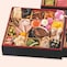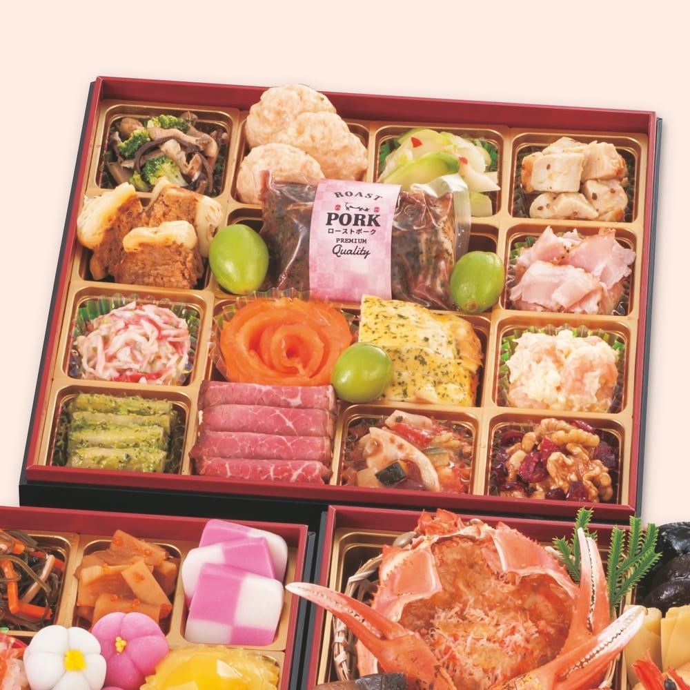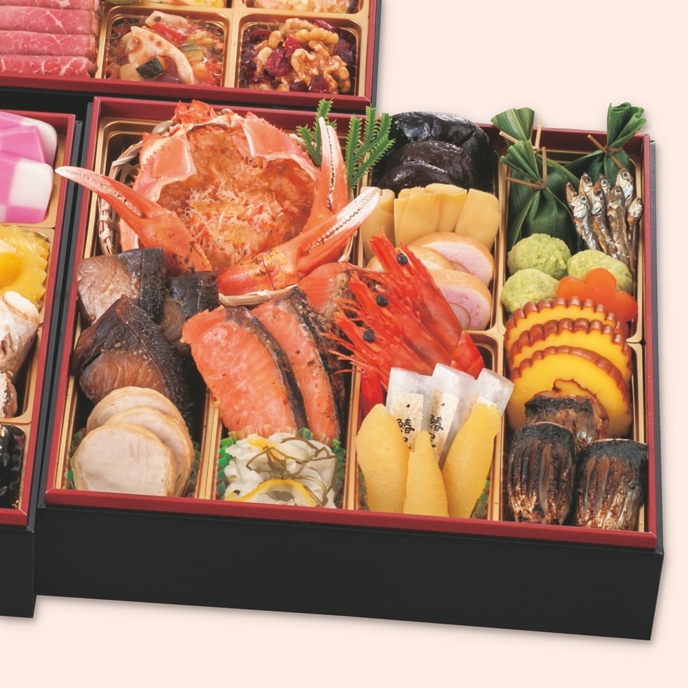 ●お品書き/【壱の重】かにほぐし身甲羅盛り(かに酢ジュレ)、かに爪、椎茸煮、たけのこ綾煮、なごみ巻海老、なごみ巻ほうれん草、牛しぐれ笹包み、田作り、たら野菜つみれ、花こんにゃく、ぶり照焼、塩レモンチキン、トラウトサーモン味噌焼、かぶら甘酢漬、海老旨煮、鰆昆布〆、数の子、伊達巻、にしん幽庵焼【弐の重】寿高野、一口昆布巻、松前漬、ハリハリ真砂和え、紅白市松かまぼこ、たたき牛蒡、いか桜花ジュレ、紅白なます、いくら、花餅白梅、花餅紅梅、栗きんとん、子持昆布山海和え、合鴨パストラミ、あんず煮、あわび旨煮、わかめ煮、小鯛俵焼、生麩 友禅包み(赤)、生麩 友禅包み(青)、一口焼湯葉、小松菜と揚げ煮物、若鶏鳴門巻、黒豆金箔【参の重】キノコとブロッコリーのバジルマリネ、えび真薯、ザーサイ、チキンのマスタードマリネ、ビーフシチューパイ、ローストポーク、若桃甘露、パストラミベーコン、蟹とあおさのサラダ、スモークトラウトサーモンローズ、鶏チーズ焼、シュリンプチーズサラダ、ごぼう抹茶、ローストビーフ、トマトバジル野菜煮込み、クランベリーくるみ