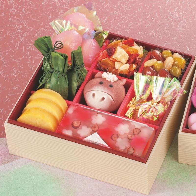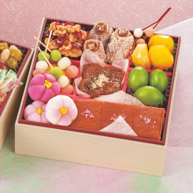 ●お品書き/【壱の重】クランベリーくるみ、干し柿、紅白松葉、栗甘露煮、月うさぎ練り切、三色団子串、わらび餅、若桃甘露、花もち 紅梅、花もち ぼかし梅、カステラ【弐の重】香り梅、ドライフルーツ、甘納豆、笹よもぎ餅、午練り切り、いちごミルクプリン、スイートポテト、きんぎょく