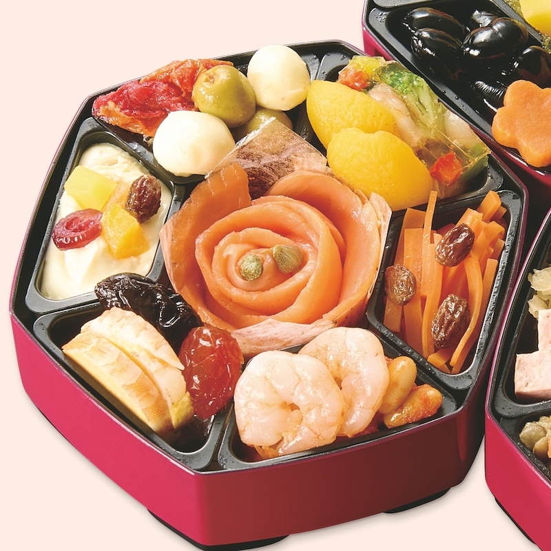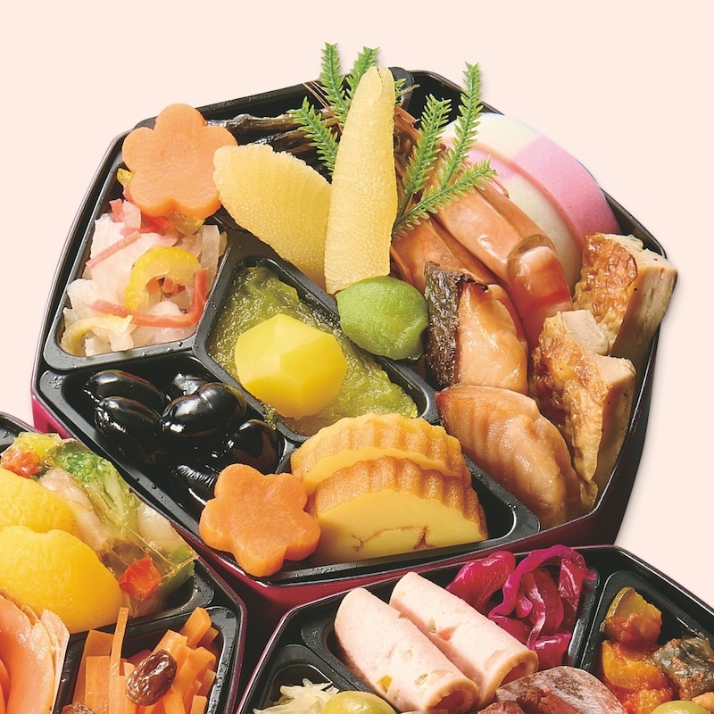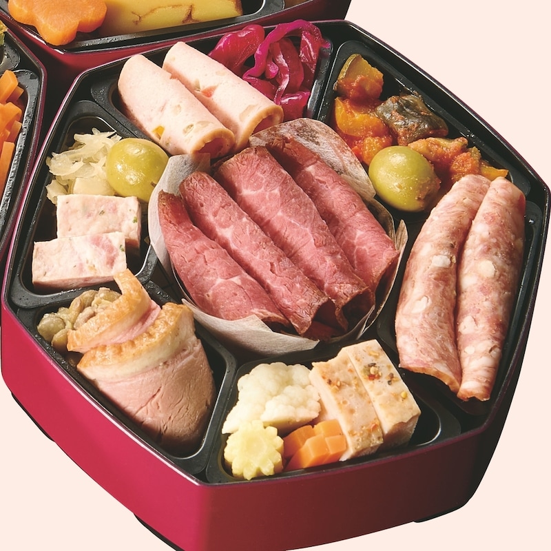 ●お品書き/【壱の重】田作り、紅白蒲鉾、海老の姿煮、鶏の香味焼、数の子醤油漬、鮭の西京焼、梅人参、紅白なます、栗金団、若桃甘露煮、伊達巻、黒豆蜜煮【弐の重】海老のゼリー寄せ、グリーンオリーブのハーブオイル漬、セミドライトマト、モッツァレラのハーブオイル漬、杏子蜜煮、人参のマリネ、ローズスモークサーモン、フルーツフロマージュ、海老のマリネ、白いんげん豆トマト煮、ドライトマト赤ワイン煮、ドライプルーン赤ワイン煮、海老風味のガランティーヌ【参の重】グリーンオリーブのハーブオイル漬、ラタトゥイユ、ビアサラミ、ホワイトパストラミ、ローストビーフ、カリフラワーのピクルス、人参のピクルス、ヤングコーンのピクルス、紫キャベツのマリネ、リオナソーセージ、カンパーニュ、ザワークラウト、合鴨スモーク、レンズ豆の煮込