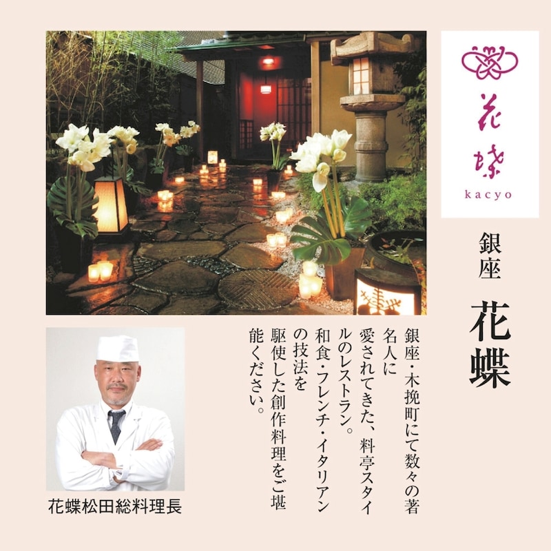 銀座・木挽町にて数々の著名人に愛されてきた、料亭スタイルのレストラン。和食・フレンチ・イタリアンの技法を駆使した創作料理を提供しています。