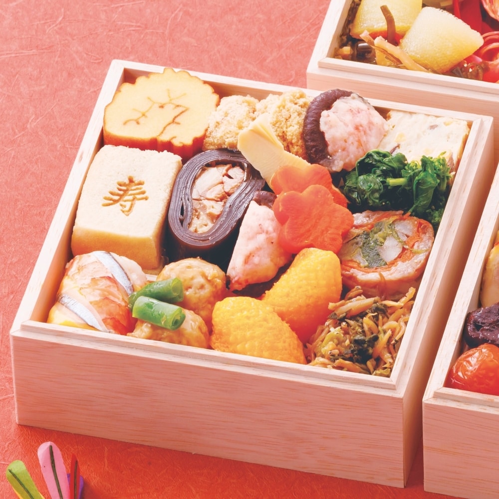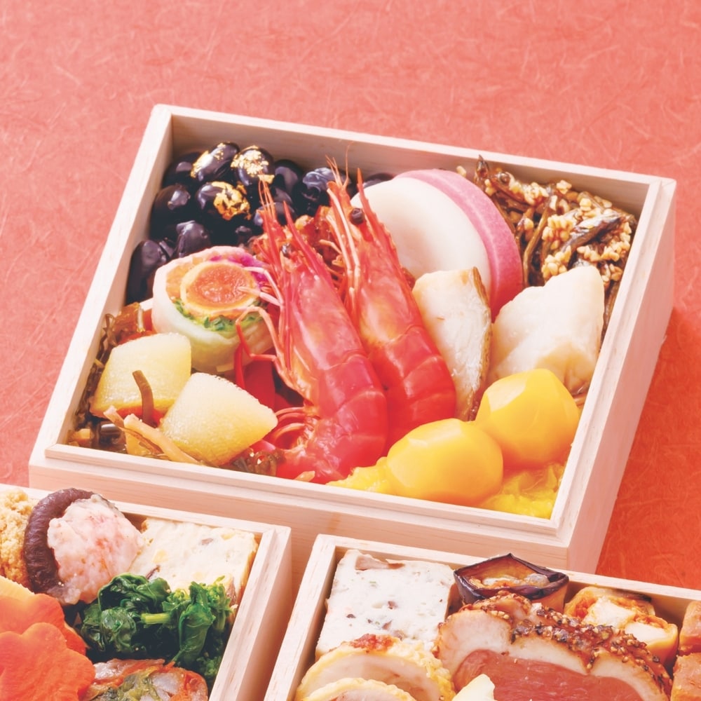 ●お品書き/【壱の重】金箔黒豆、アーモンド入り田作り、栗きんとん、数の子入り松前漬、紅白かまぼこ、カラスガレイ西京焼、浜汐えび、彩りきぬた巻、くるみのかつお和え【弐の重】伊達巻、ぶりの子煮、山形県産きのこの松風、寿高野豆腐、海老椎茸、身欠きにしん昆布巻、竹の子土佐煮、わかめ出汁漬、梅花人参、菜の花福良漬、山形牛旬菜巻、えびときびなごの手綱巻、蓮根入りつくねの照り煮、いんげん、松笠いか雲丹焼、ちりめん青菜炒め煮【参の重】きのこと魚介のテリーヌ、茄子のカネロニ、合鴨パストラミ、栗と柚子のチーズケーキ、鶏のガランティン、真鱈のソテーそら豆のジェノベーゼ、ヤリイカのカルピオーネ、大根と人参のマリネ、鶏肉とプルーンの赤ワイン煮、ドライトマトの赤ワイン煮、マトウダイのソテーシャンピニオンソース、ほうれん草のバターソテー