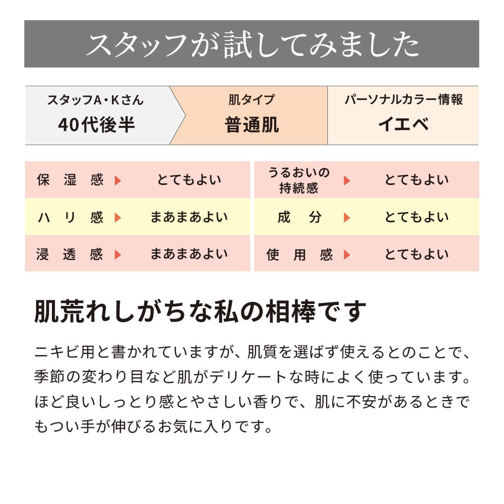 ニキビの原因となるキメの乱れや乾燥を防ぎながら、うるおいに満ちた肌へ導く薬用化粧水です。