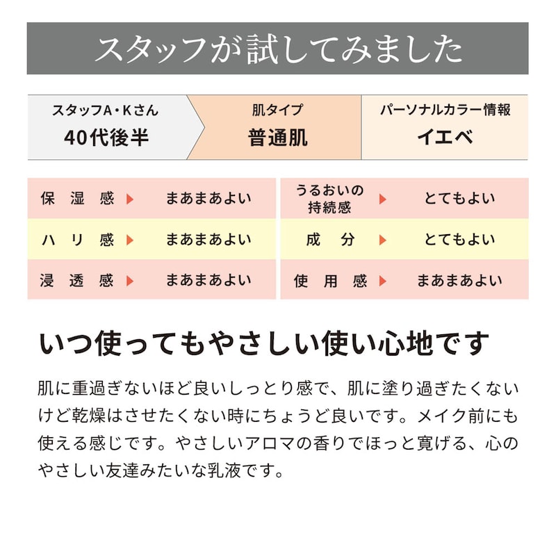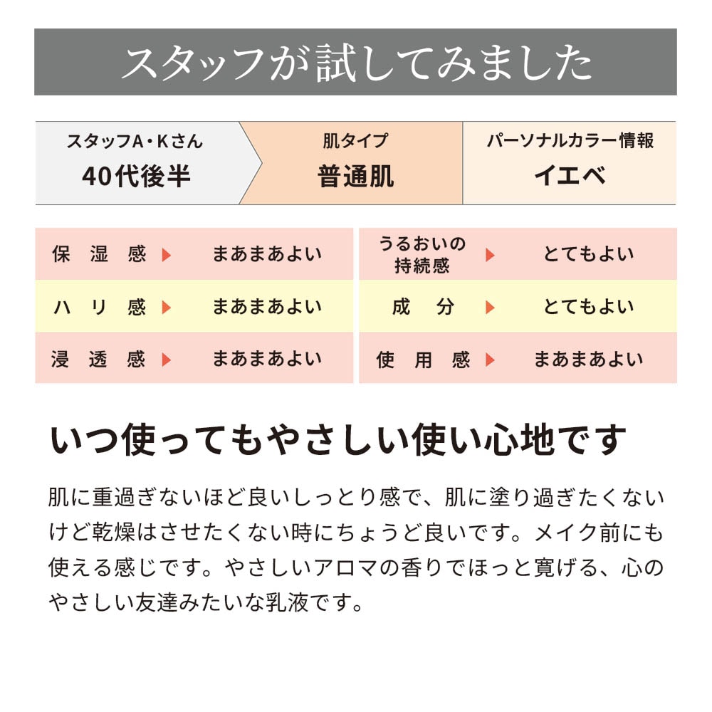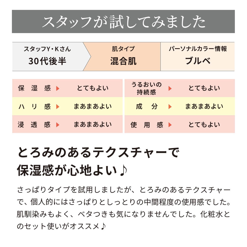化粧水でととのえた肌のみずみずしいうるおいを保ち、キメ細やかなすべすべ肌へ導きます。