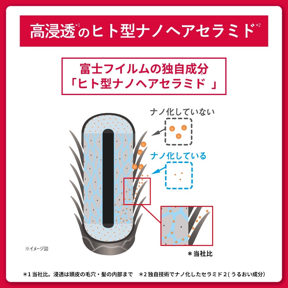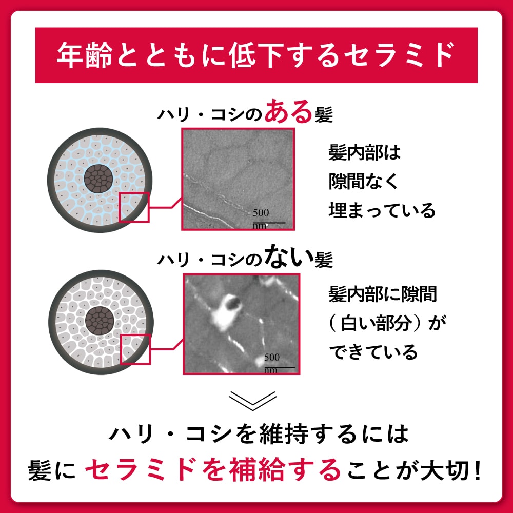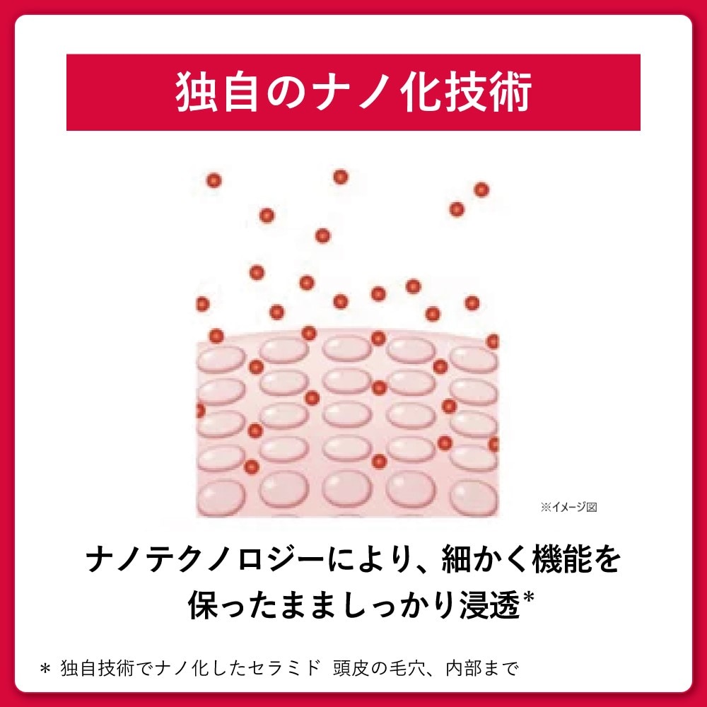 独自技術でナノ化した「ヒト型ナノヘアセラミド(※1)」を配合。髪の内部に浸透し、年齢とともに失われるセラミドを補いキューティクルを補修。