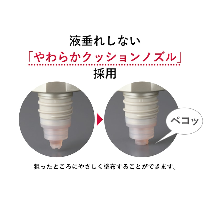 逆さにしても液垂れせず、先端を「ペコッ」と押し当てることで適量をピンポイントに塗布できます。
