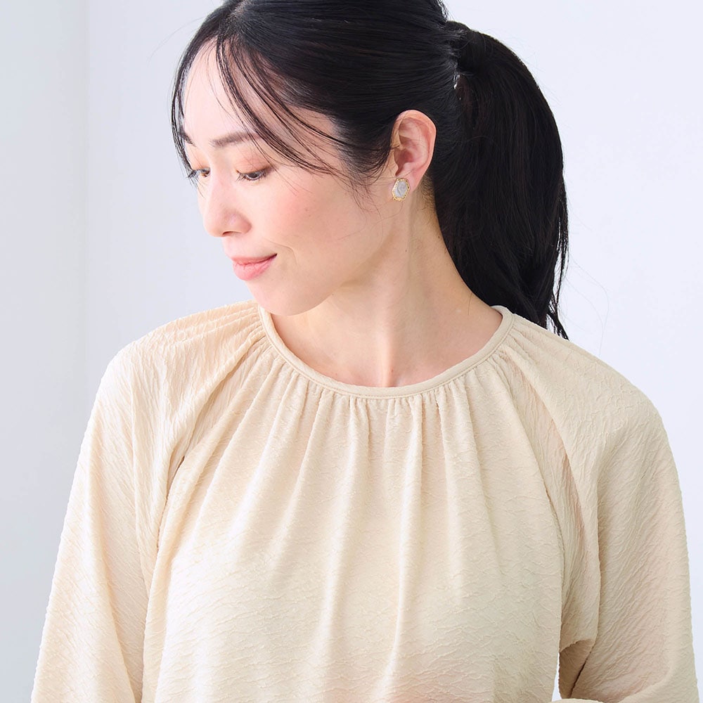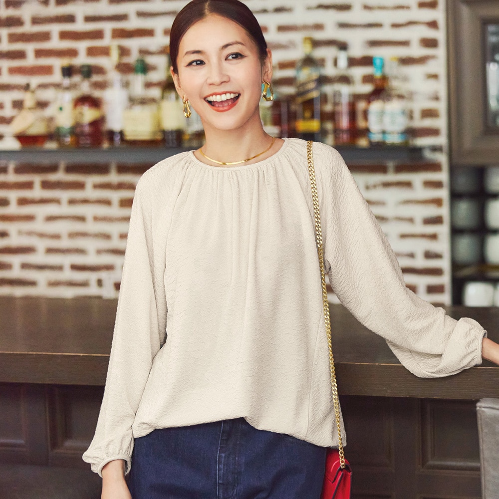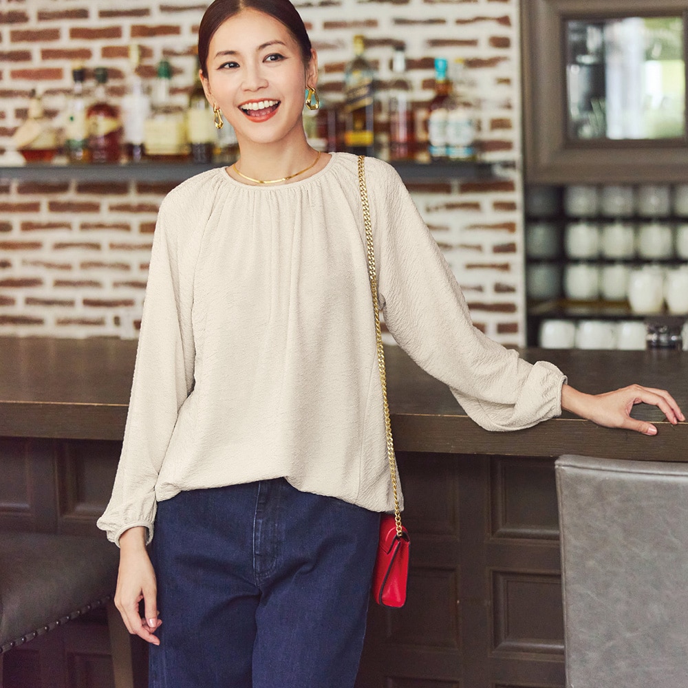 • 襟ぐりはギャザーデザインでエレガントな印象に