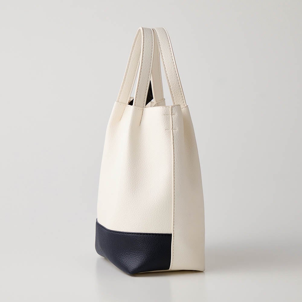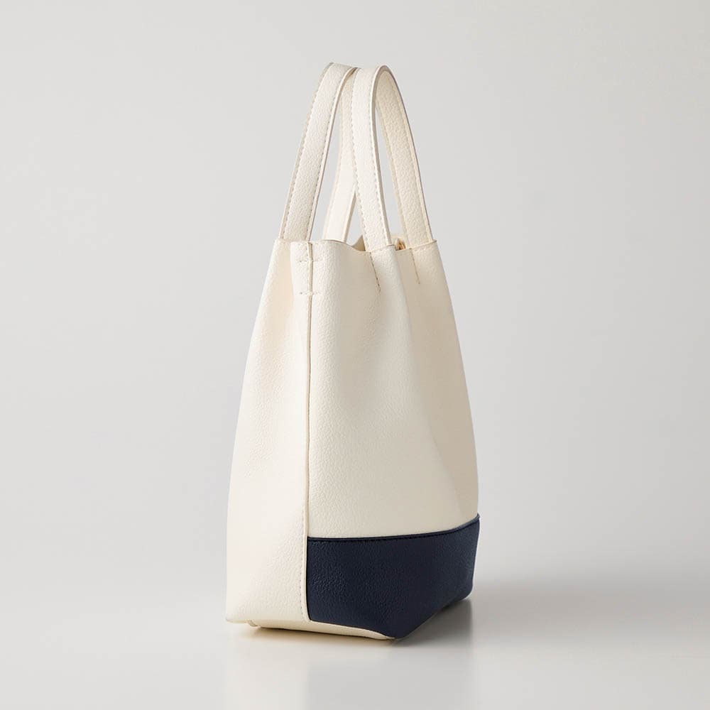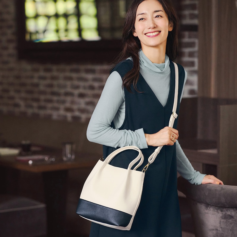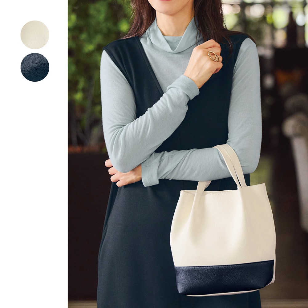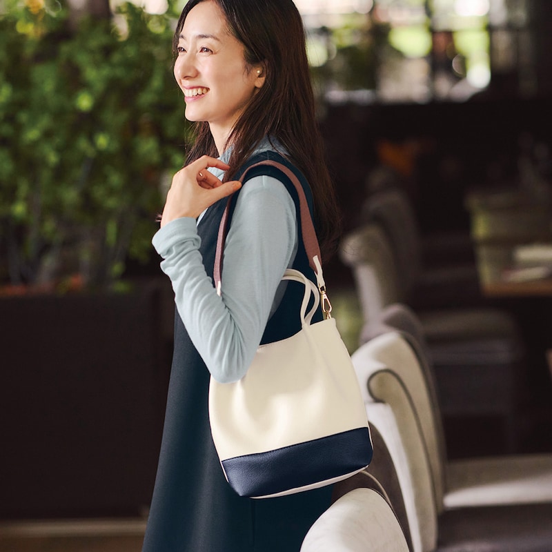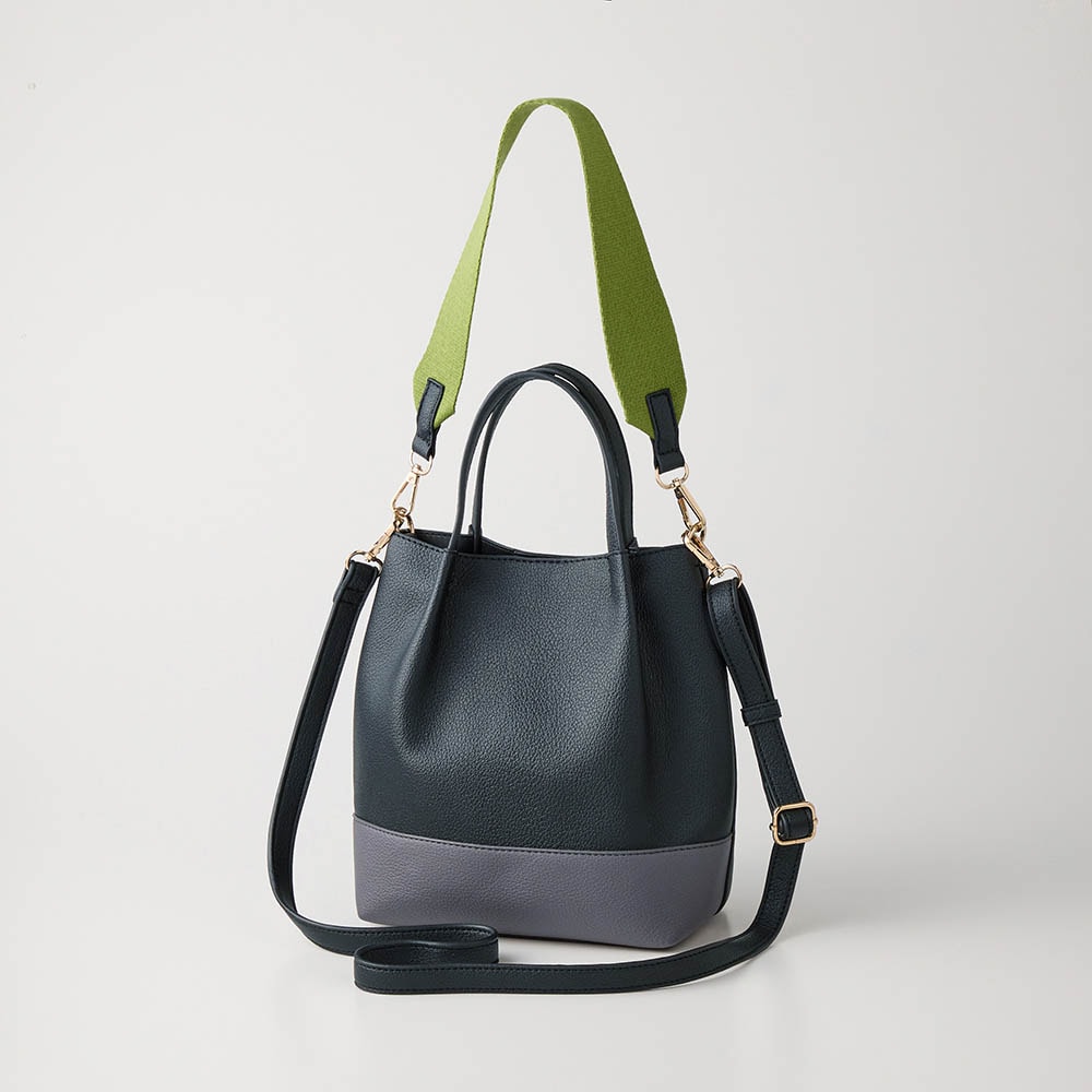 入れ口が小さいです。サイズ表示は横幅20センチ・奥行11センチになっていますが、上部入れ口は横幅13~15センチ・奥行8~10センチほどです。入れ辛いことはありませんが、大きい物はちょっと斜めにして出し入れしています。グリーンの肩掛けベルトですが、これを使うと持ち手が脇に触って気になります。斜め掛けできるくらい長ければ使ったかもしれません。