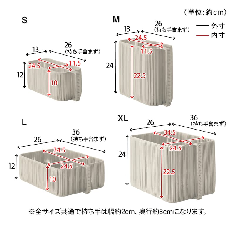 ■S/サイズ:約26×13×12(高さ)cm(持ち手含まず)、内寸サイズ:約24.5×11.5×10(高さ)cm、製品重量:約360g