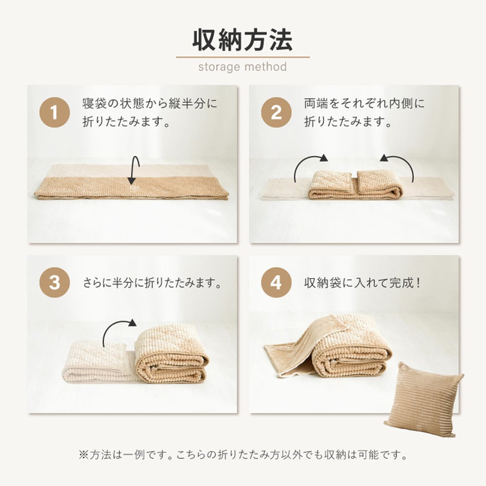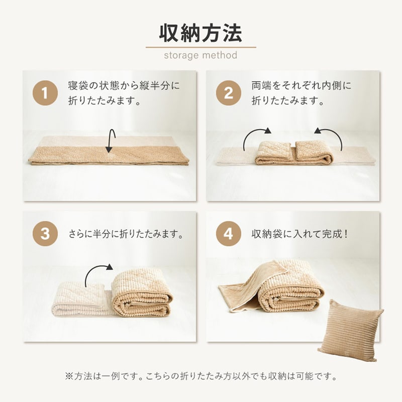 ●広げてこたつ掛け布団に、ファスナーをしめれば寝袋に、専用の収納袋にいれてクッションに様変わり