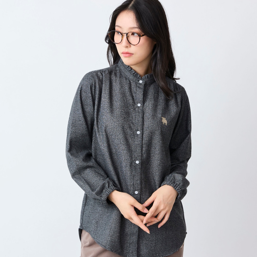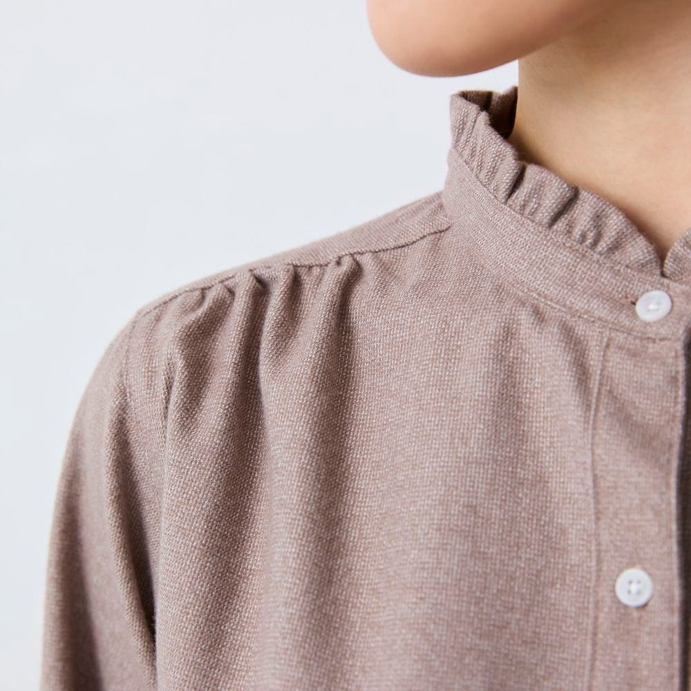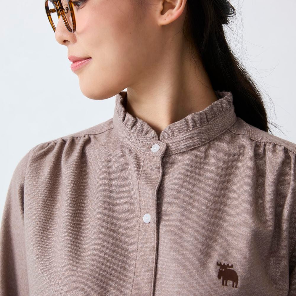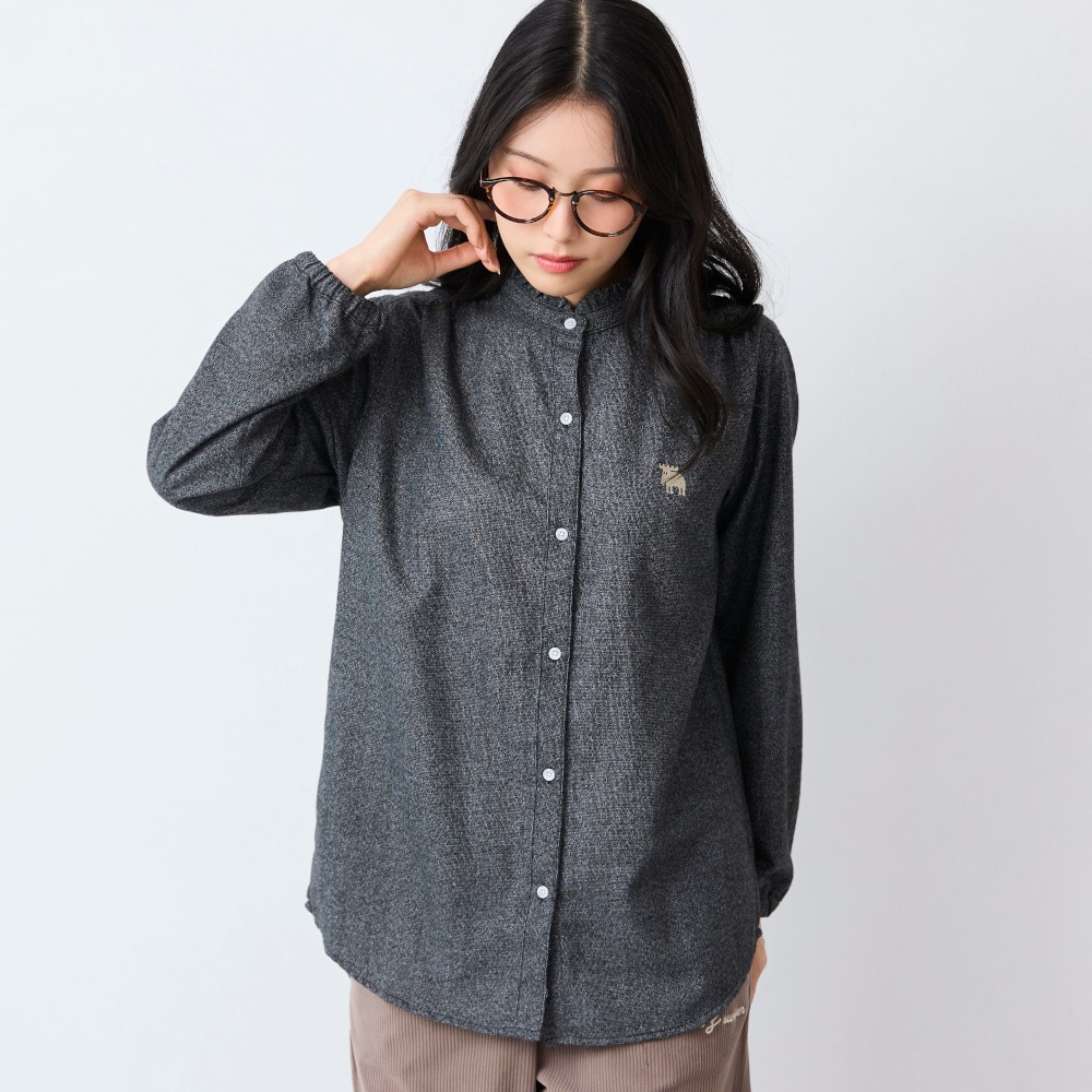 襟のフリル、両肩と背中のギャザー、胸の刺繍、生地の色(チャコール一色ではなく、白が混ざったような杢色?)…デザイン全てが可愛くて購入して良かったです。