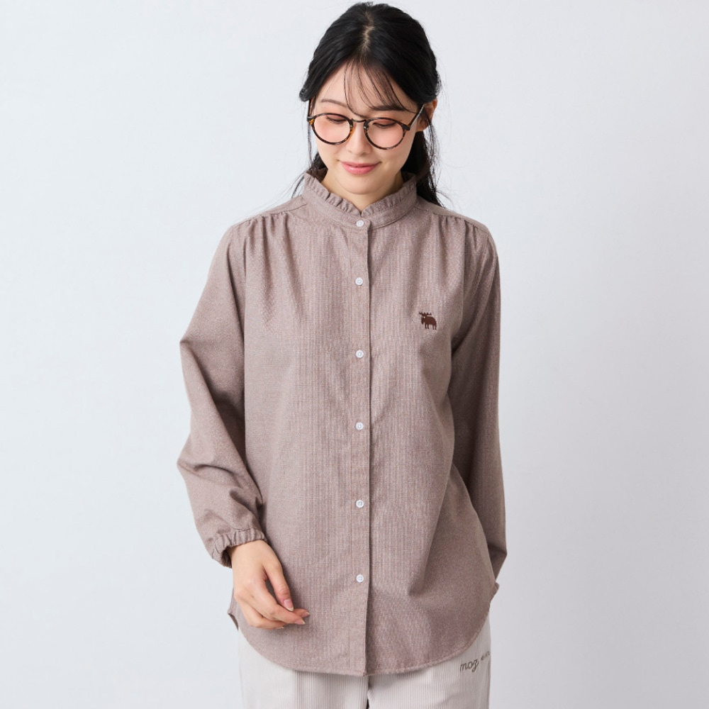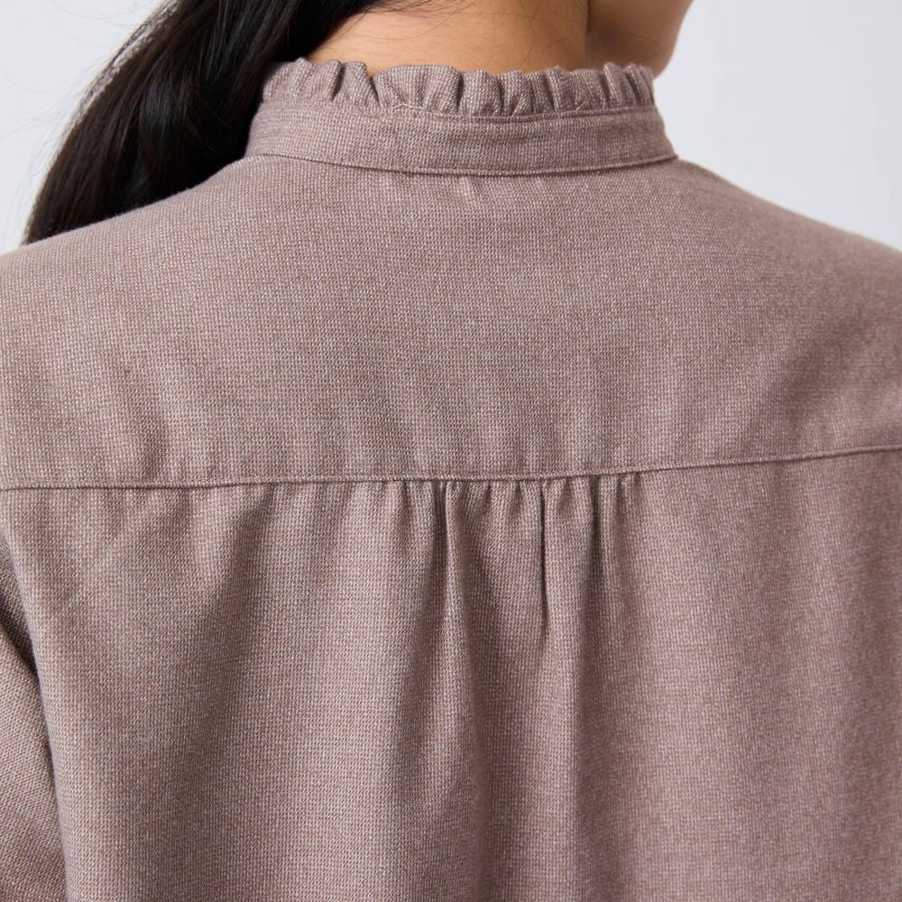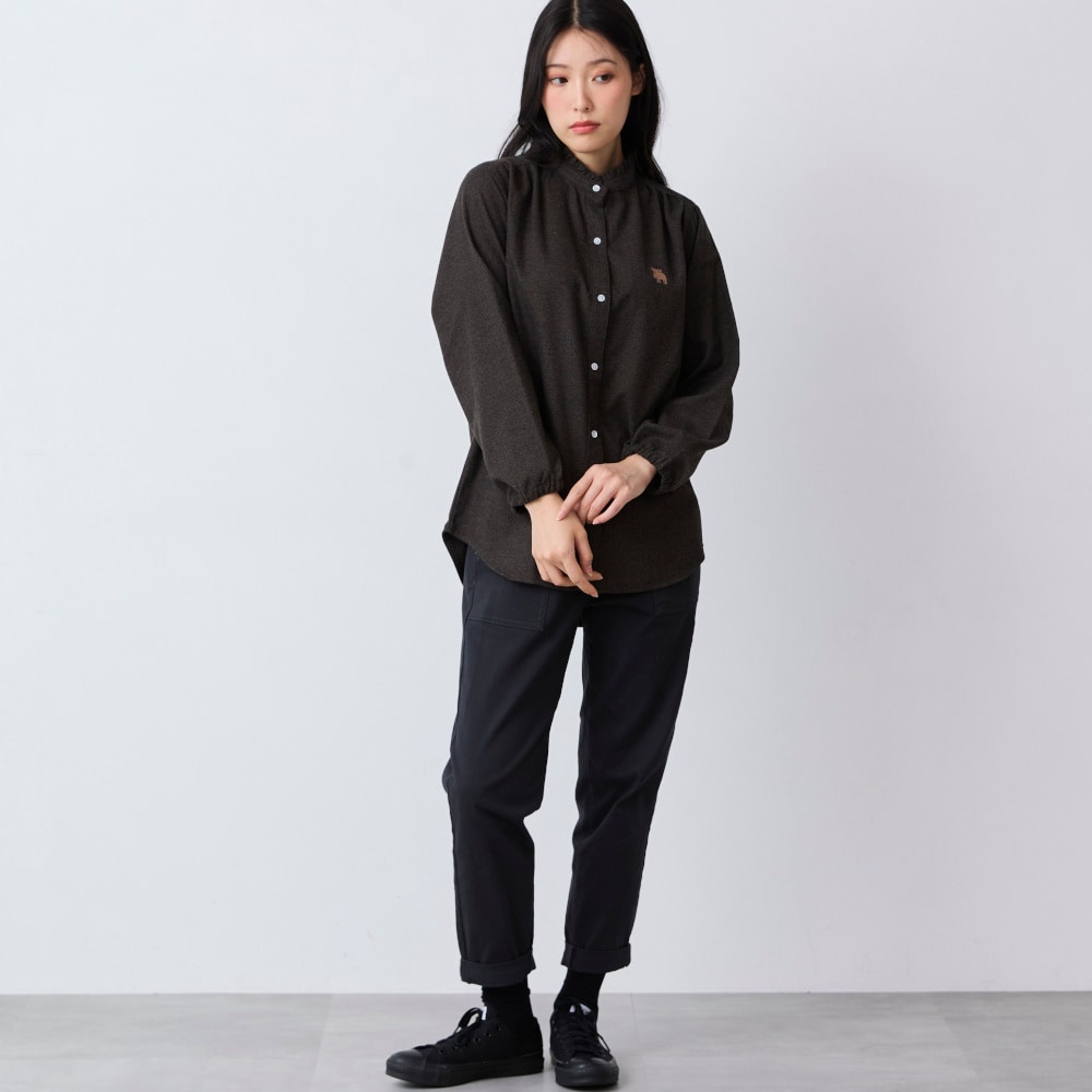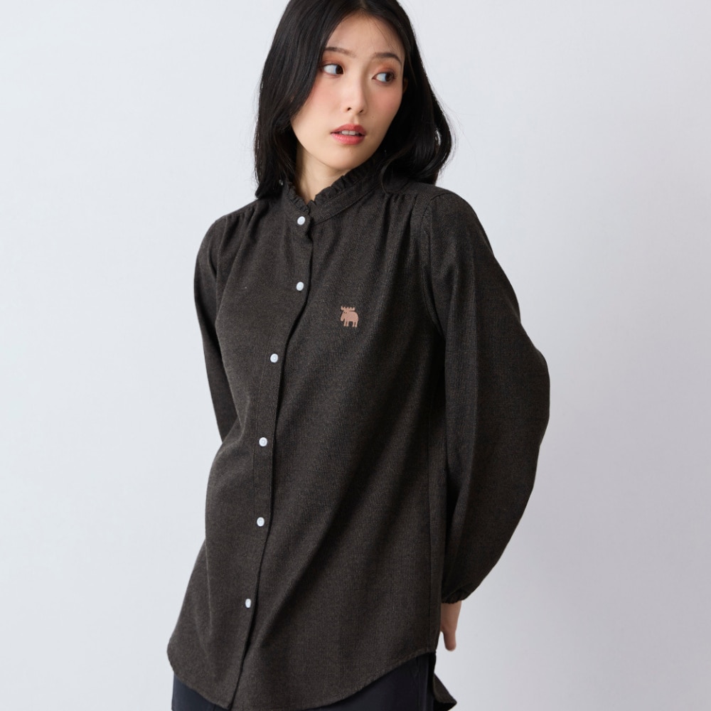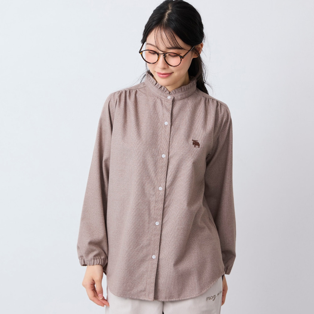襟のフリル、両肩と背中のギャザー、胸の刺繍、生地の色(チャコール一色ではなく、白が混ざったような杢色?)…デザイン全てが可愛くて購入して良かったです。