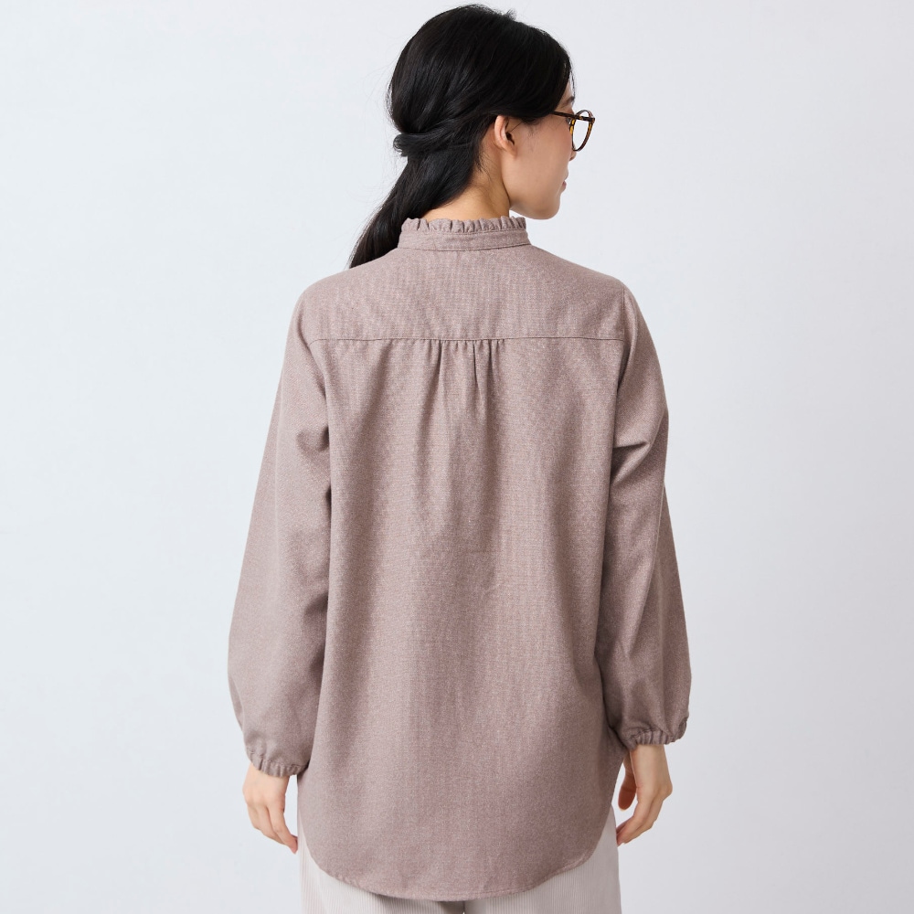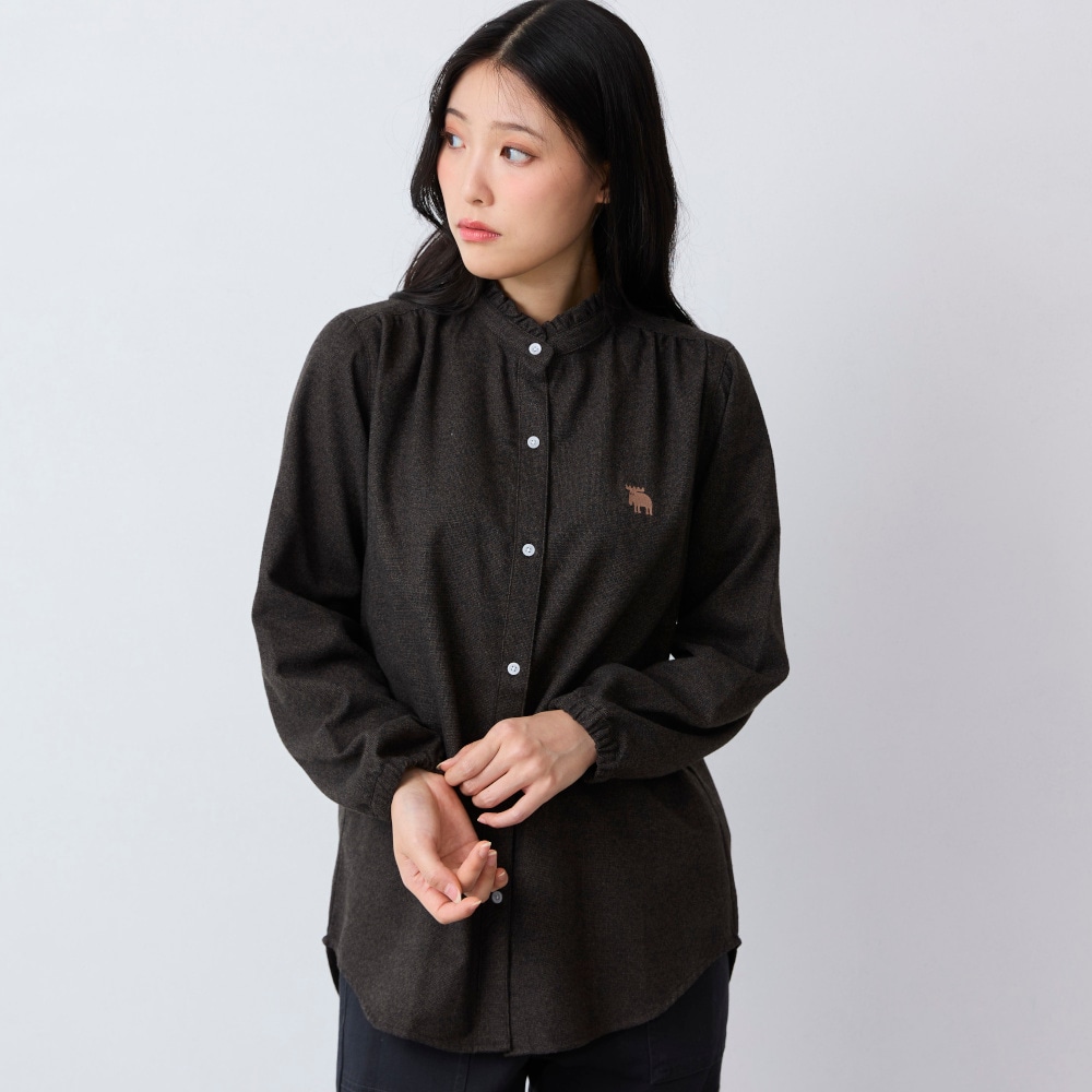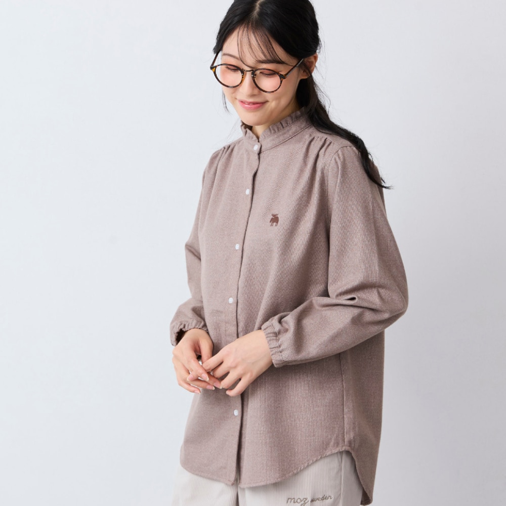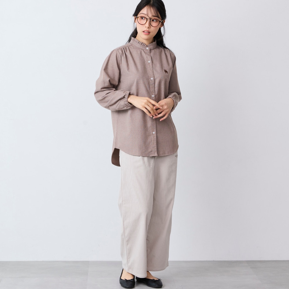 襟のフリル、両肩と背中のギャザー、胸の刺繍、生地の色(チャコール一色ではなく、白が混ざったような杢色?)…デザイン全てが可愛くて購入して良かったです。