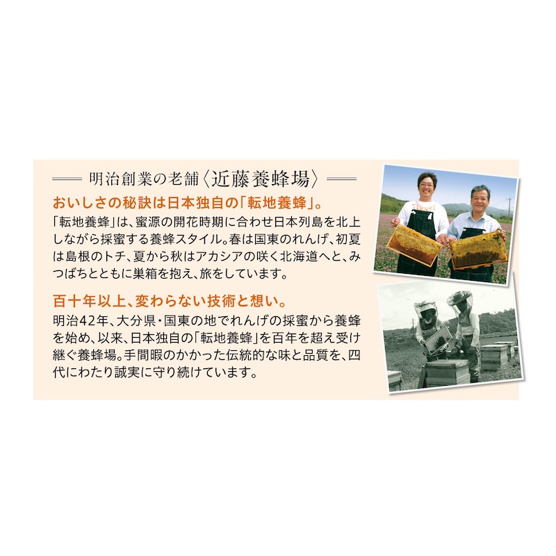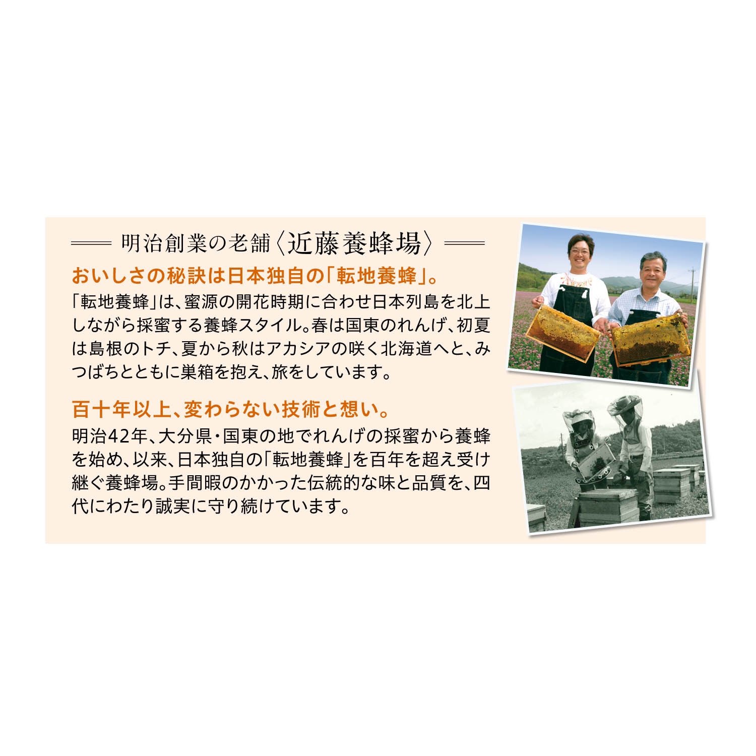 みつばちとともに、日本各地の花々から「転地養蜂」で採蜜した貴重な蜂蜜。手間暇かけたおいしさを。