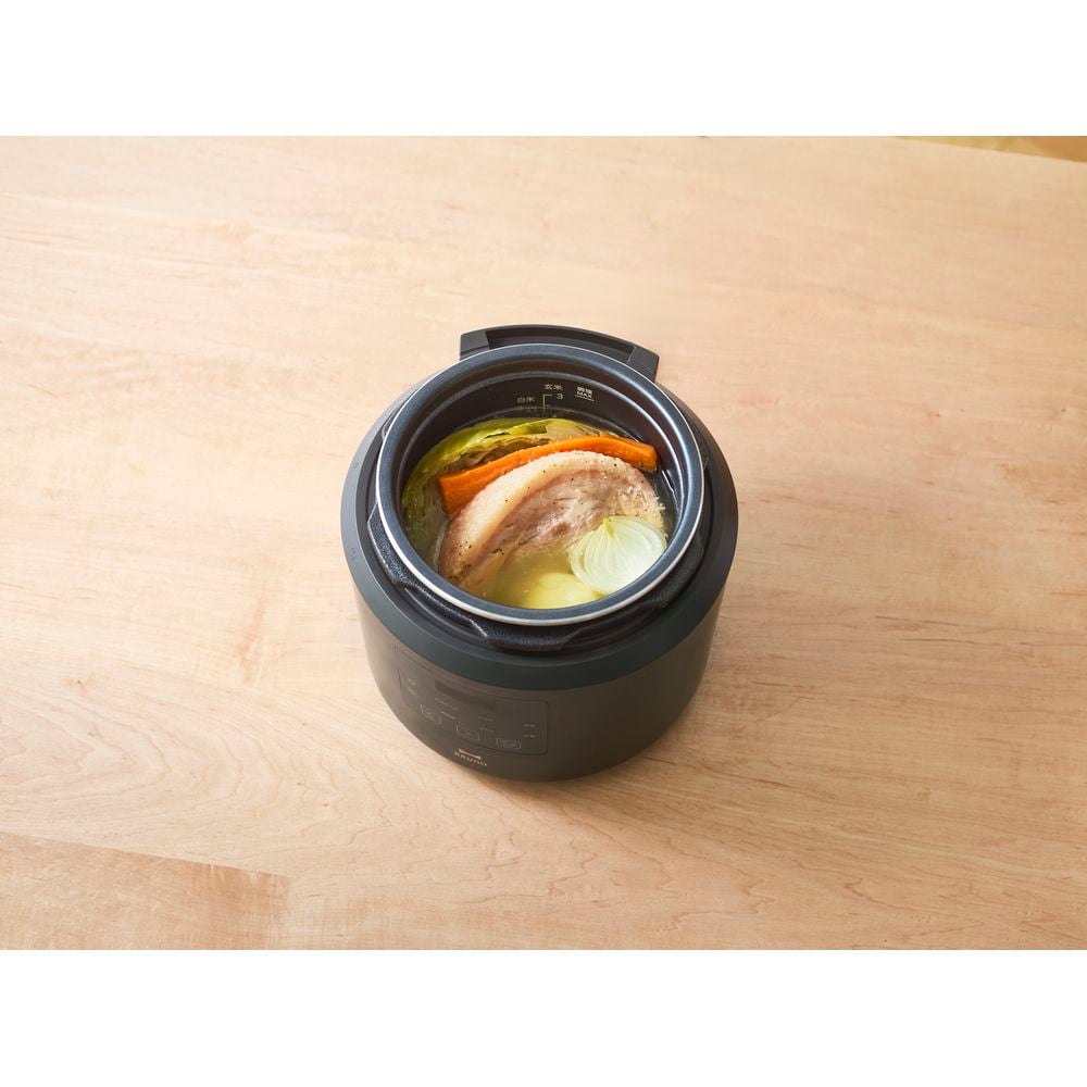 ●主要機能/4種の楽々メニュー(カレー/豚角煮/ポトフ/炒飯)、予約モード、お気に入り登録モード(1種登録可能)、保温(最大12時間)、レシピモード(圧力調理/炊飯調理/煮込み調理/無水調理/蒸し調理/低温調理/スロー調理/発酵調理/ベイク)