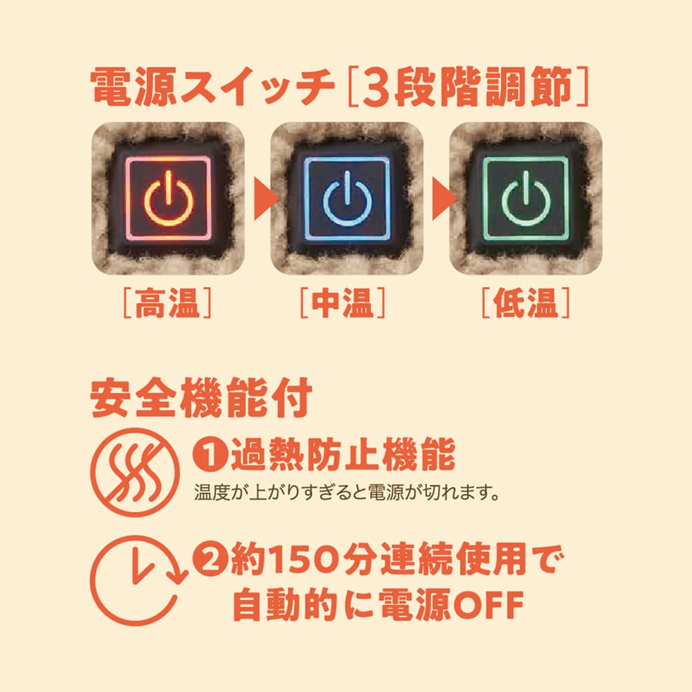 ●約150分自動電源オフ機能や、加熱防止機能の安全機能付き
