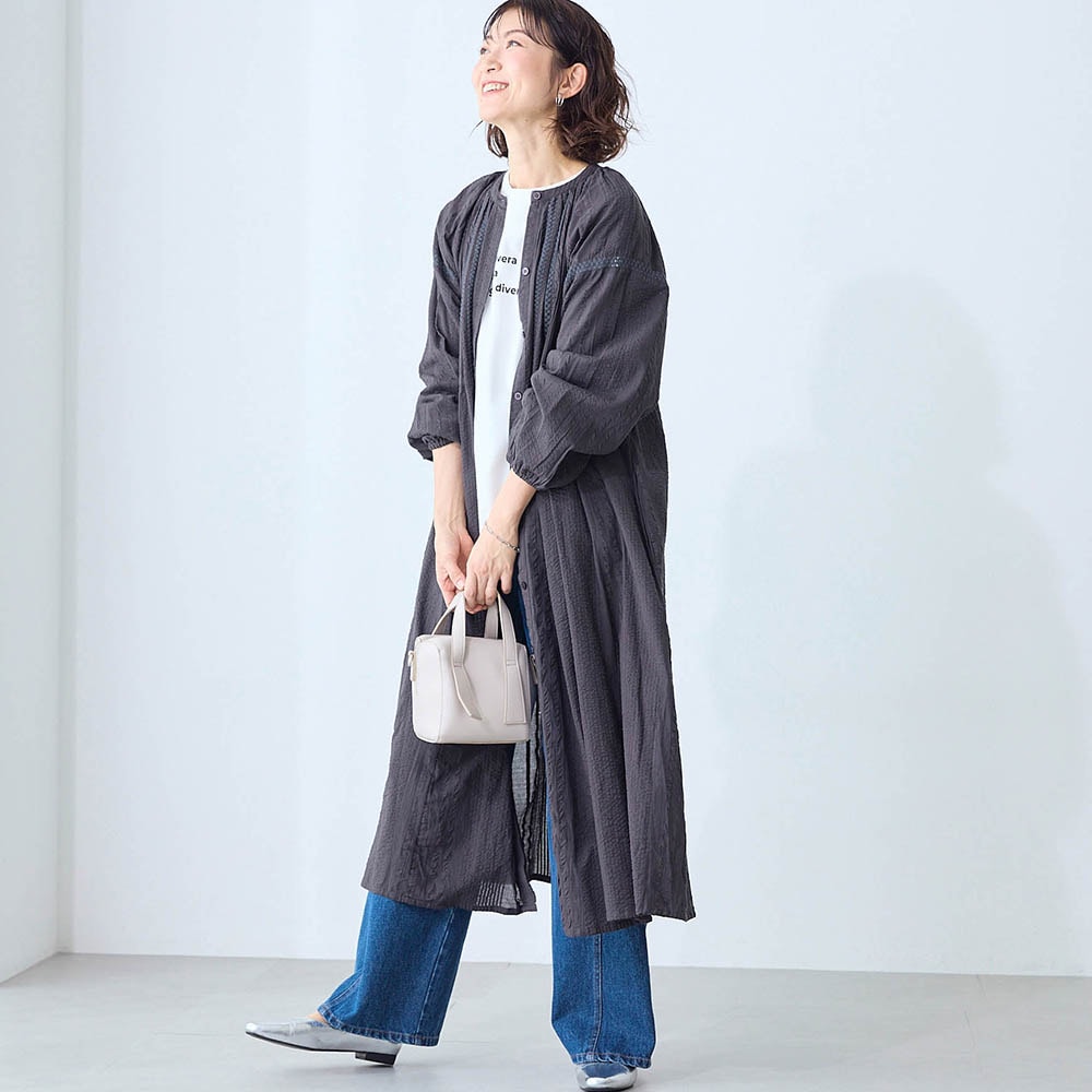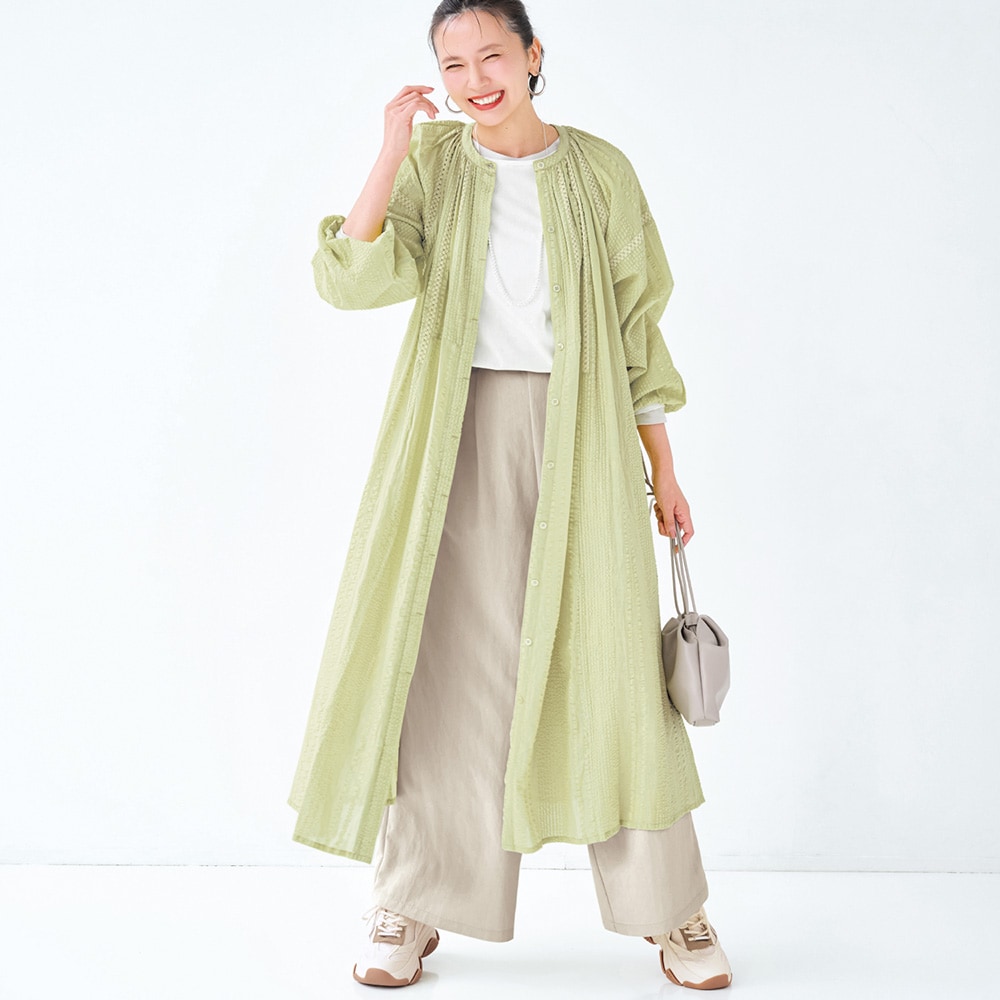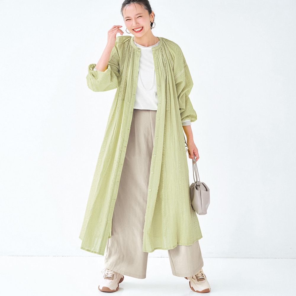 パンツスタイルに羽織るのにもワンピースとしても様になり着回せそうです。