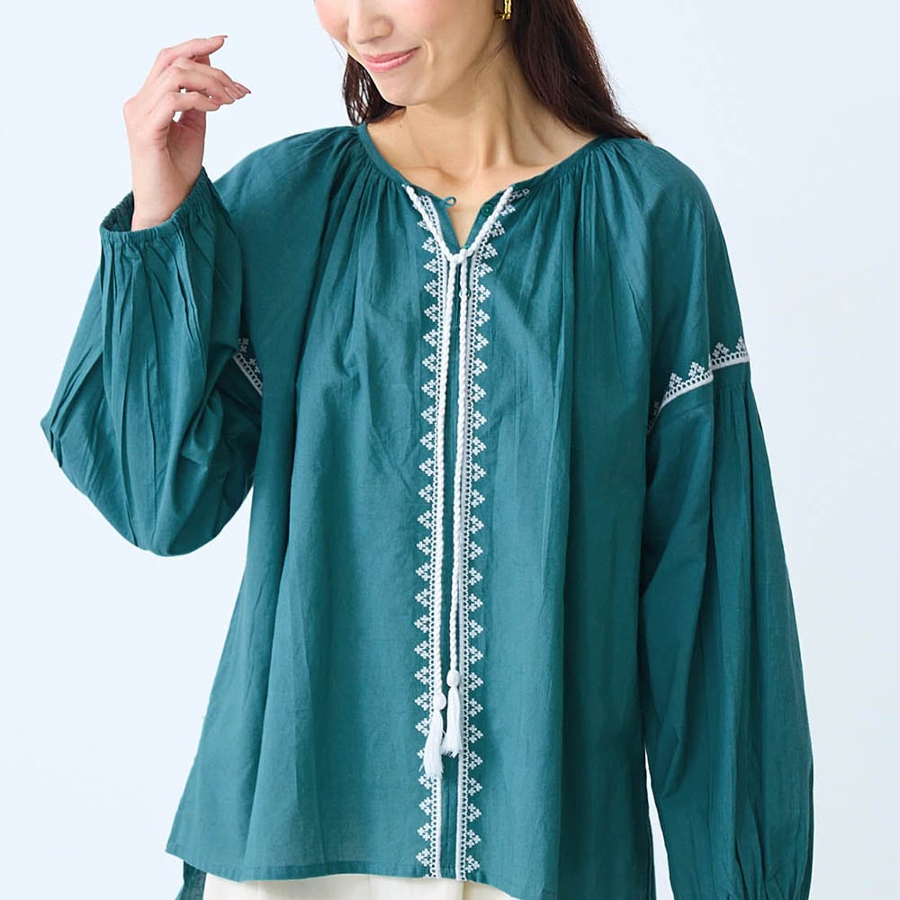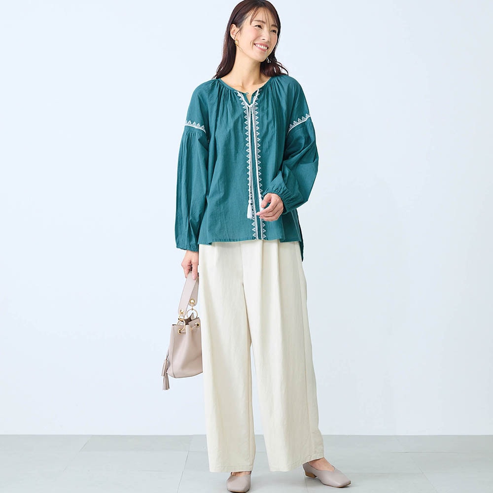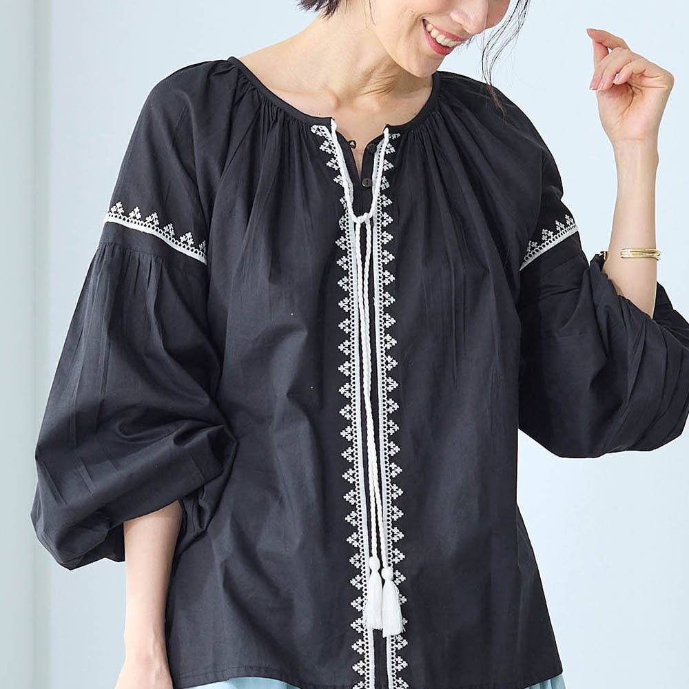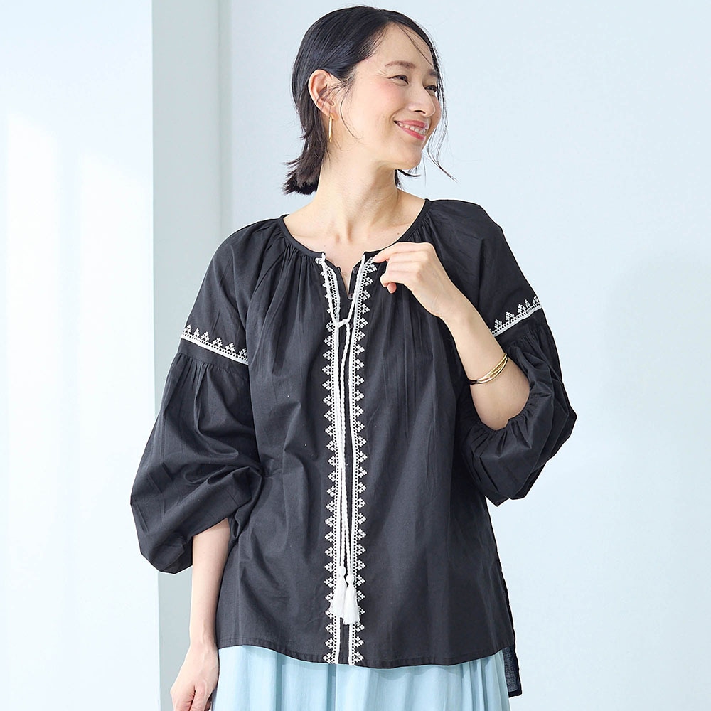 綿ローンは以前から好きで、夏のお洋服としては重宝なので、購入しています。黒を購入。黒と白のコントラストの刺繍、素材、ふわっと着られるデザインで購入を決定しました。試着のみしました。これからの季節使えそうです。