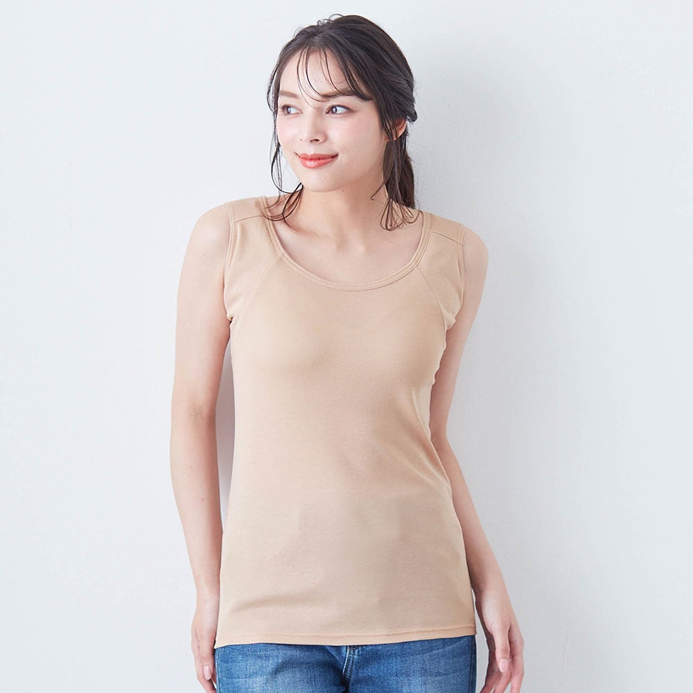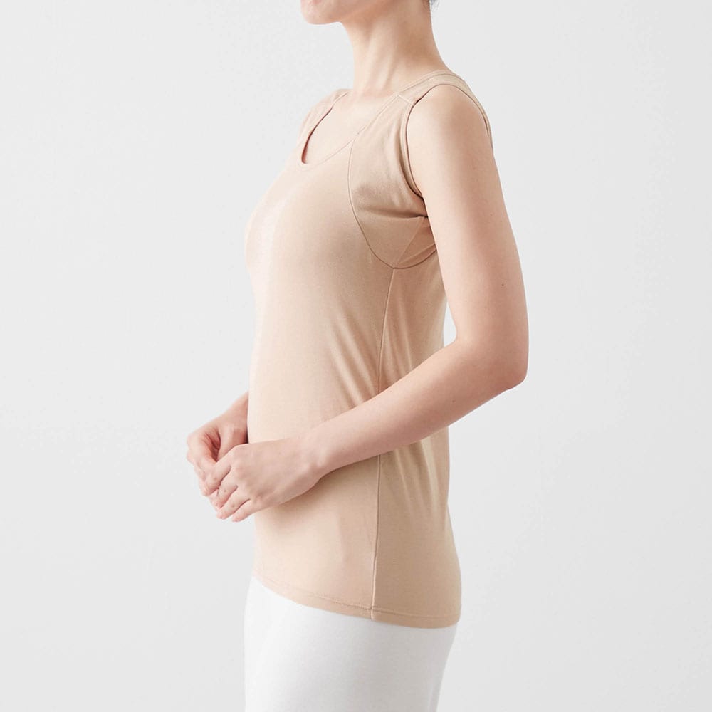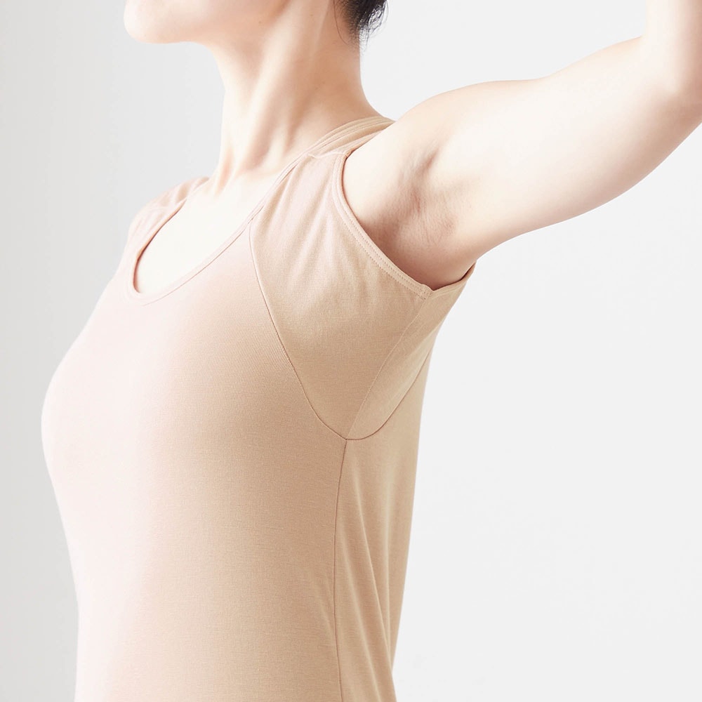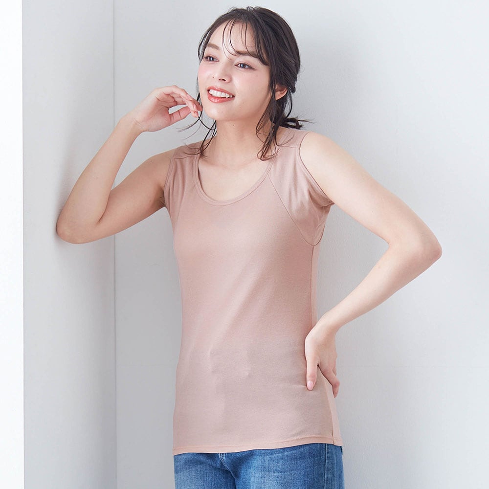 何より脇汗が年中気になっています。このタンクトップは,今まで試した脇汗パット付きインナーの中で一番,脇にフィットします。汗をしっかりパットが受け止めてくれるので,服に汗が移りにくいのが嬉しいポイントです。肌触りは,レーヨン・ポリエステル素材でなめらか。そして綿も入っているので心地がいいです。一年中快適に着られそうです。