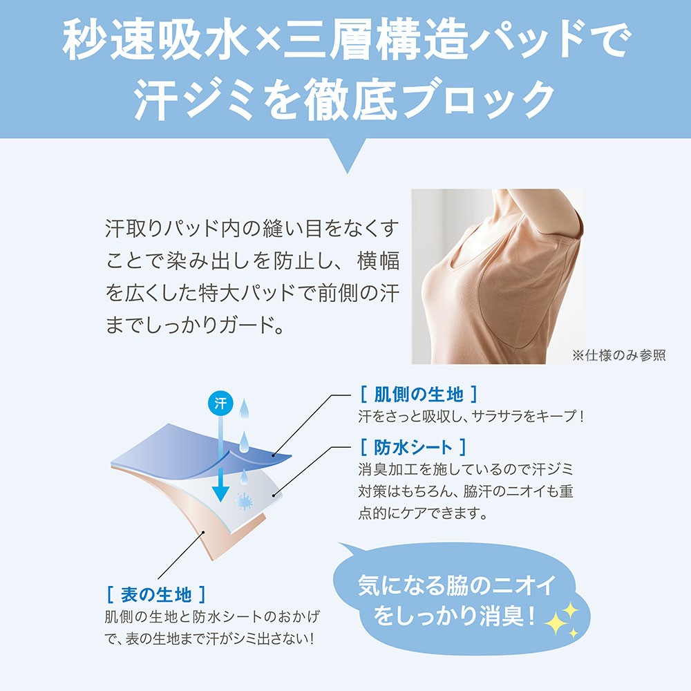 ・脇パッドの防水シートは消臭加工を施しているので、脇汗のニオイも重点的にケア