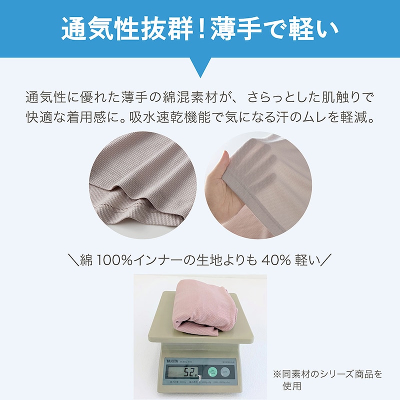 肌離れが良く、通気性に優れた薄手の綿混素材でサラッと快適