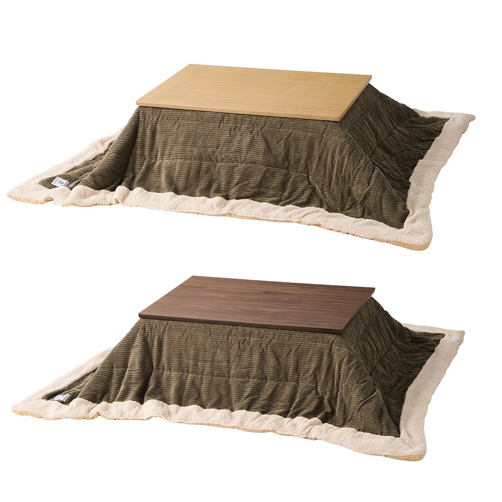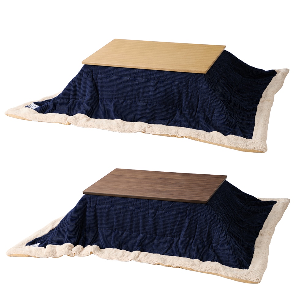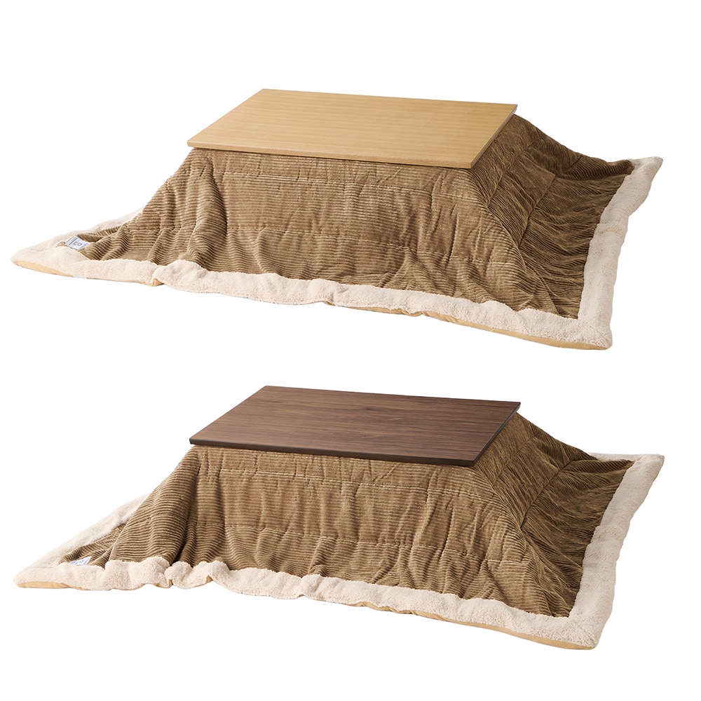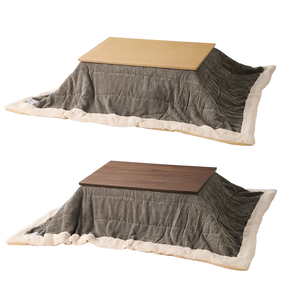 ●ナチュラルの天板にはアッシュ材、ブラウンにはウォルナット材を使用し、こたつ布団を合わせても木の質感を楽しめます