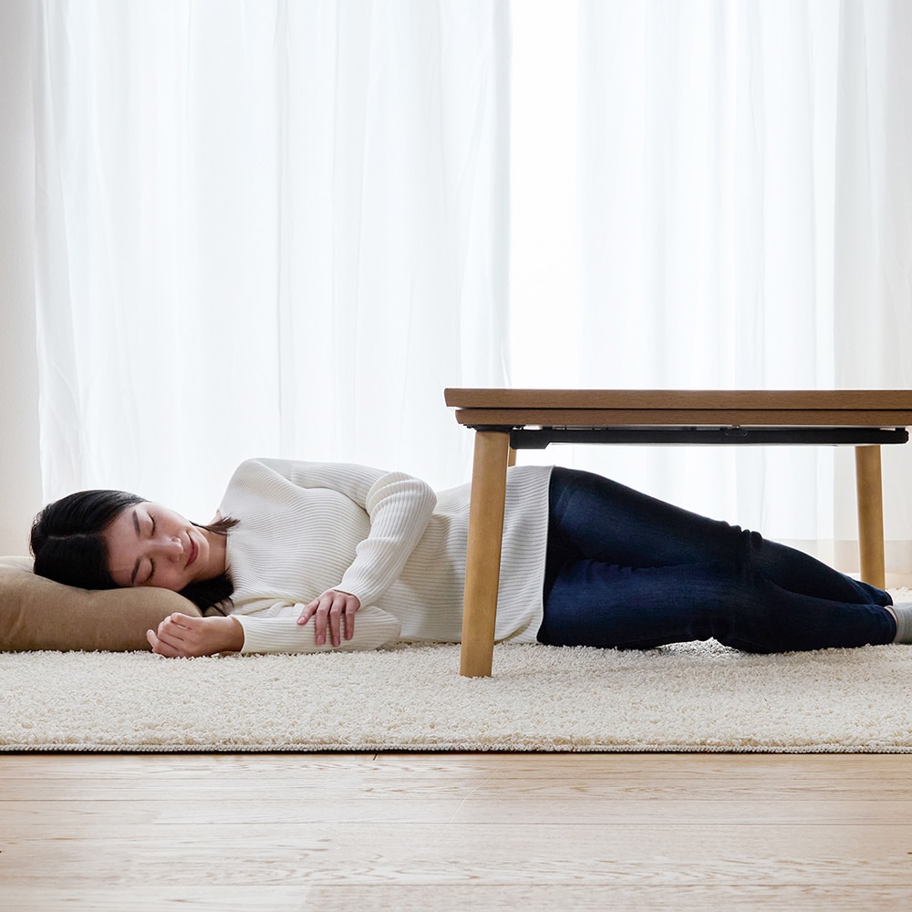 ●薄型のフラットヒーターはこたつ内部を広々と使えるので、自由な姿勢でゆったりとくつろげます