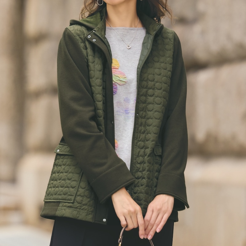 ●素材:表地:キルト部分:ポリエステル100%、無地部分:ポリエステル68%・綿29%・ポリウレタン3%、裏地:(キルト部分):ポリエステル100%