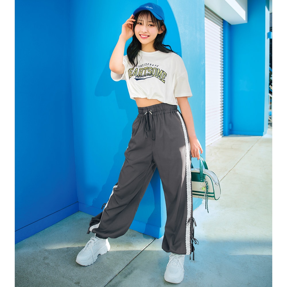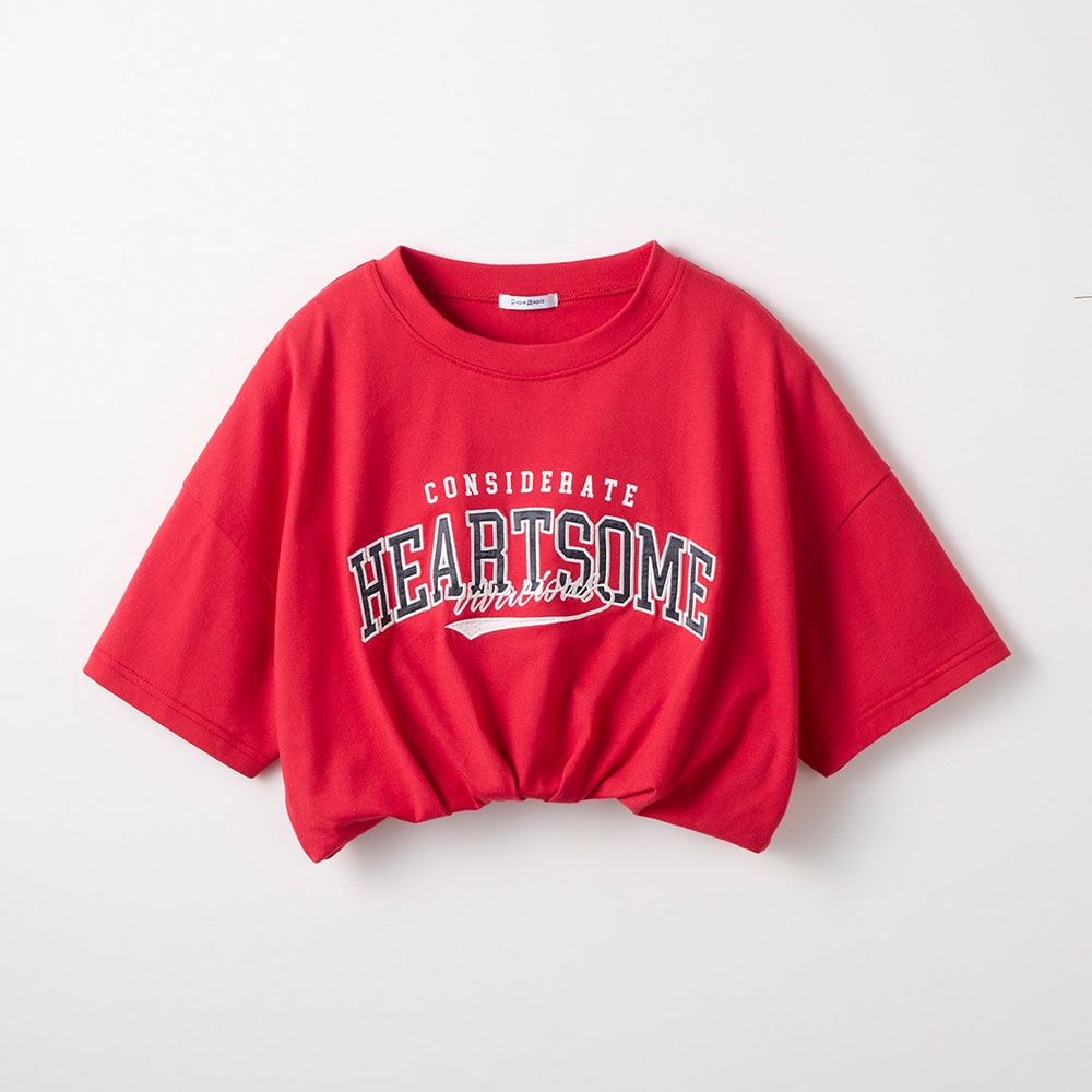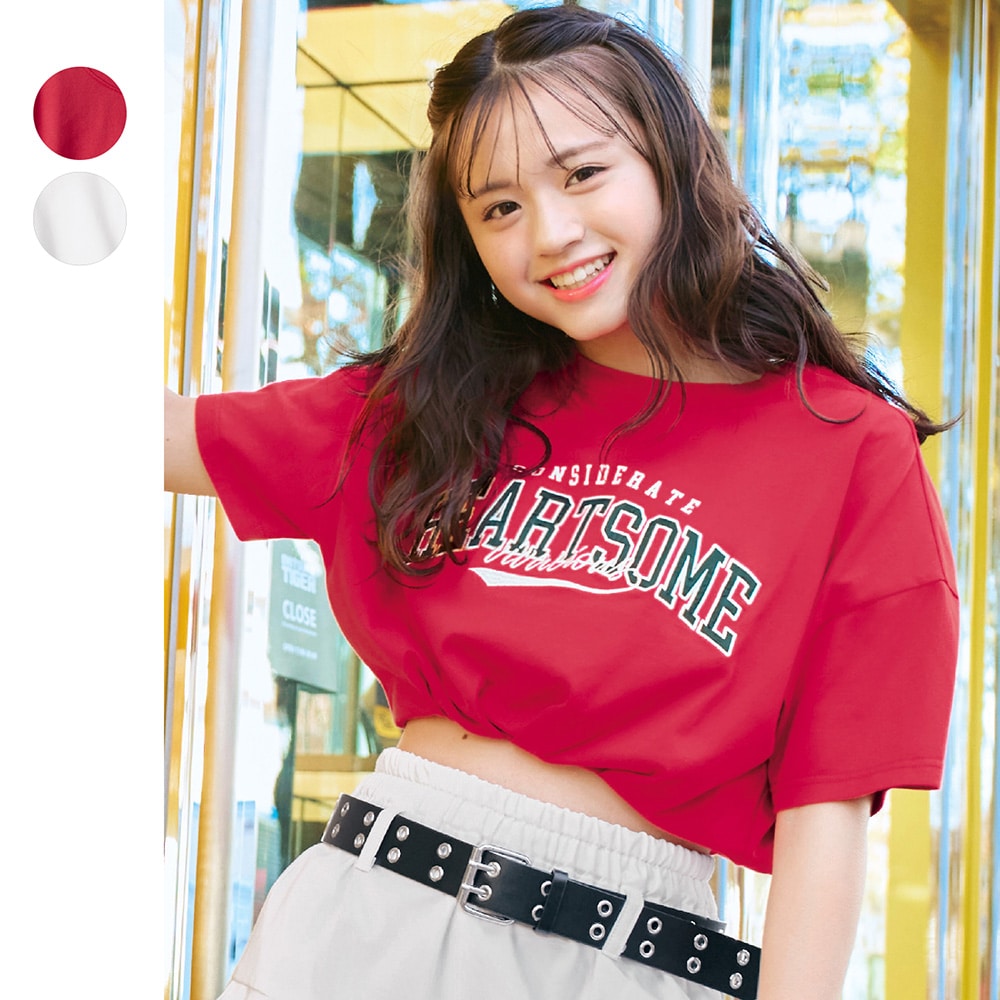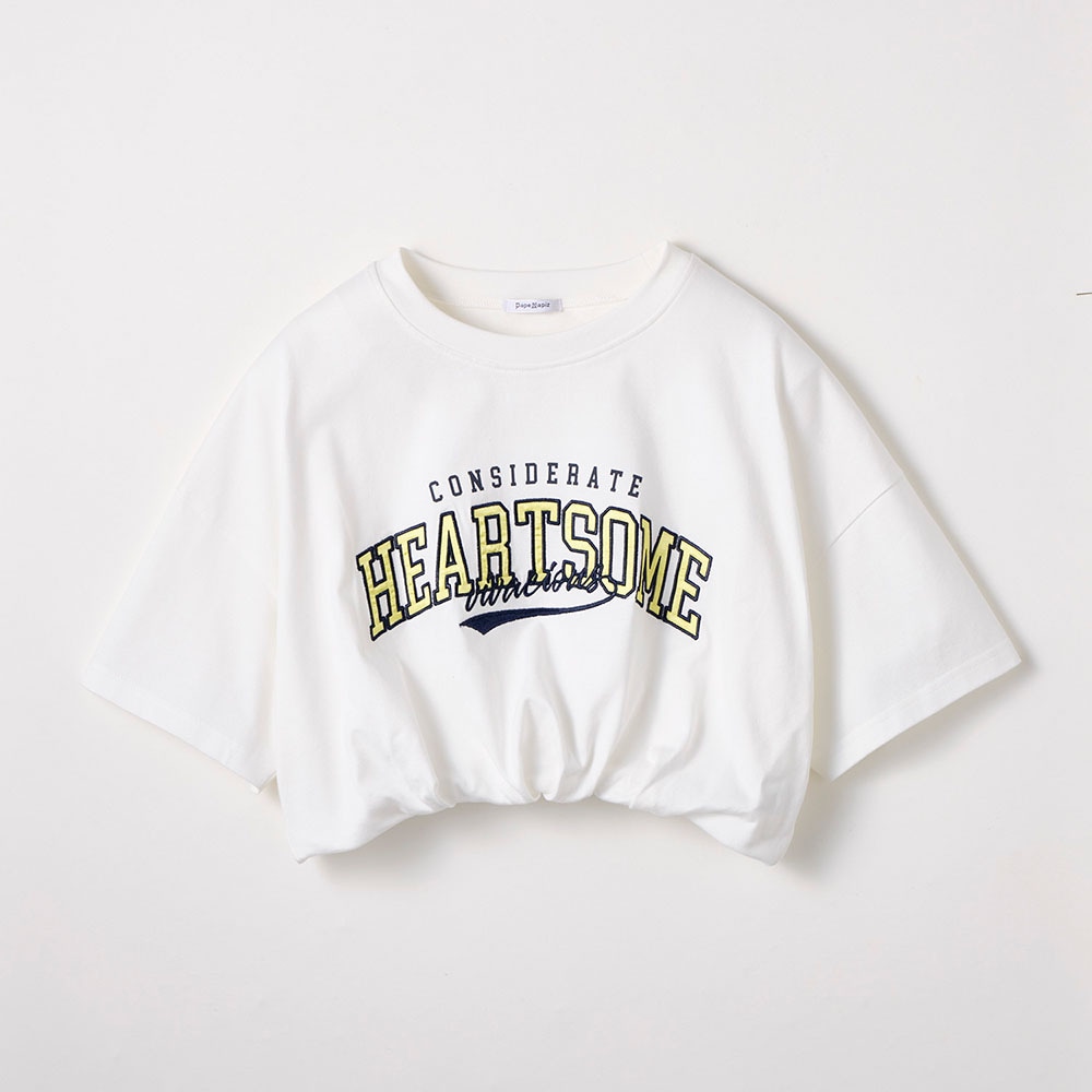 裾バルーンへそ出しクロップド丈サテンワッペン綿素材半袖Tシャツ 【子供服】