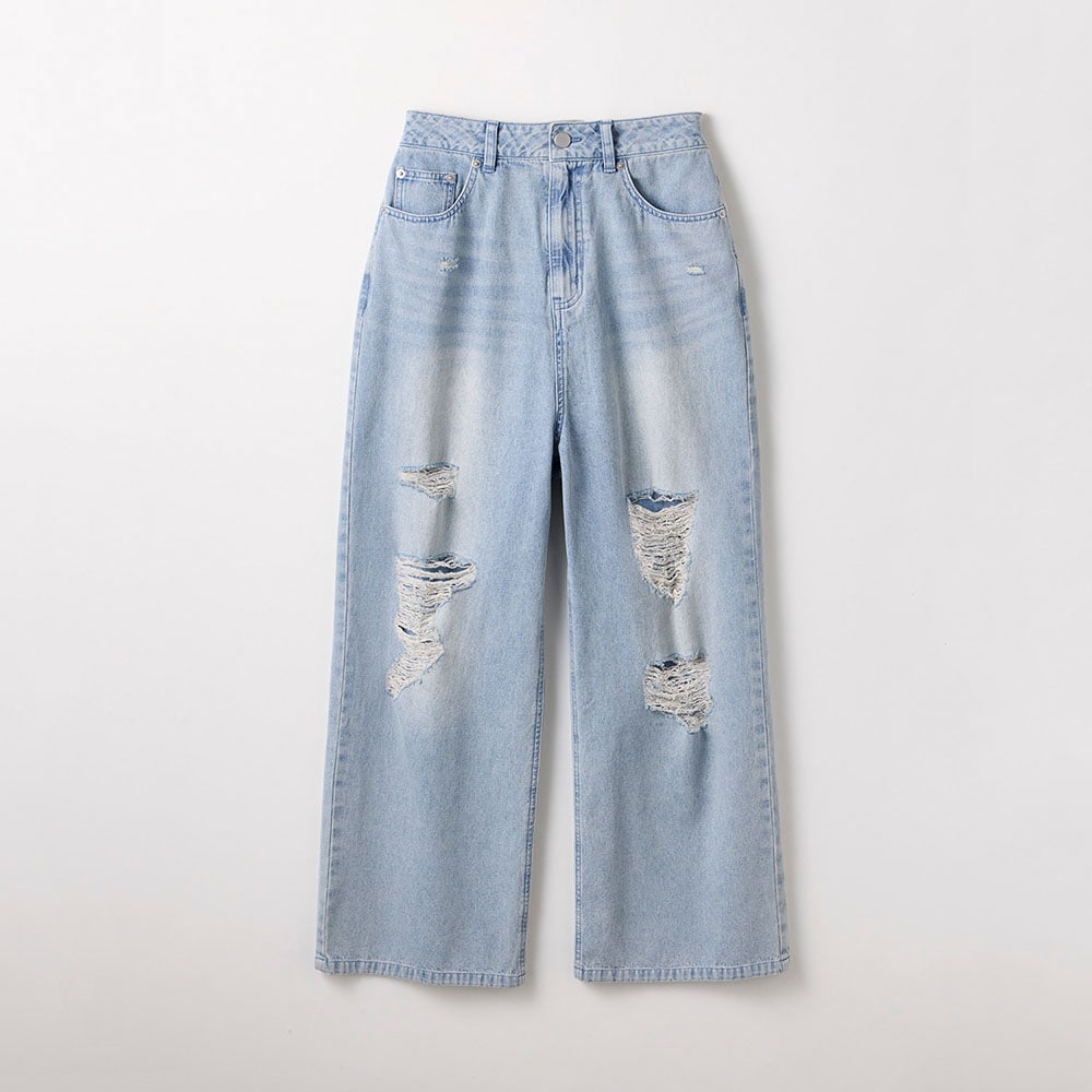 ※デニム・ダメージ加工の特性上、仕上がり寸法及び色・ほつれのニュアンスが多少異なることがあります。