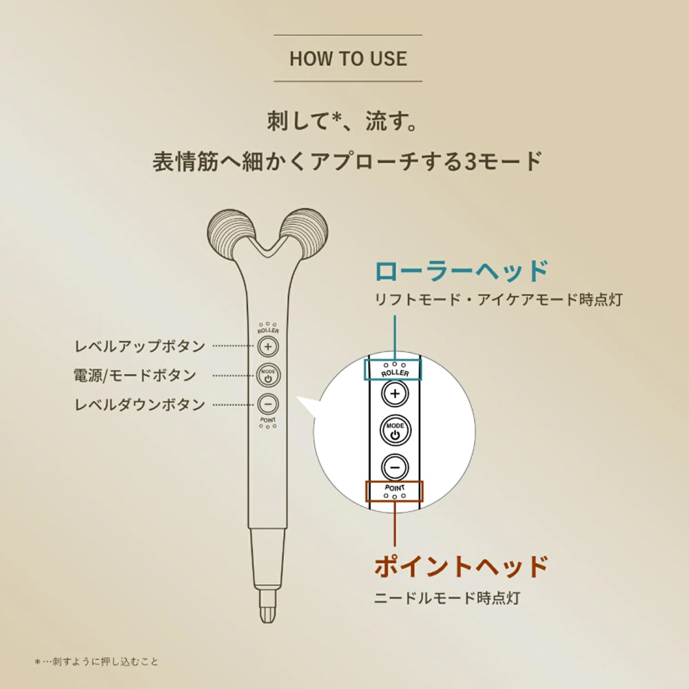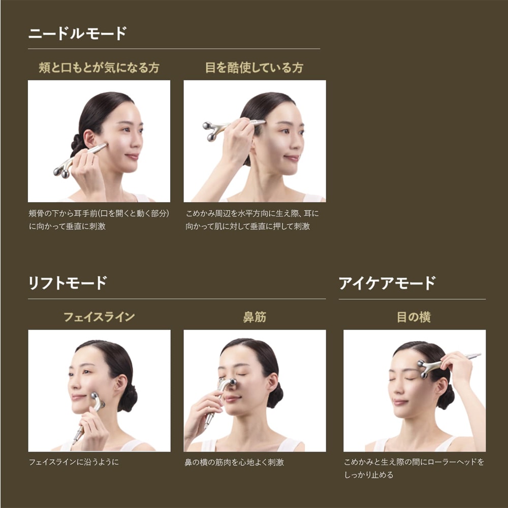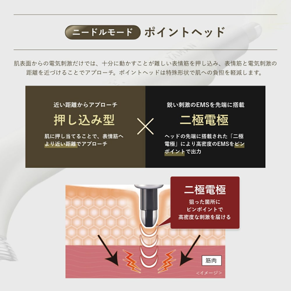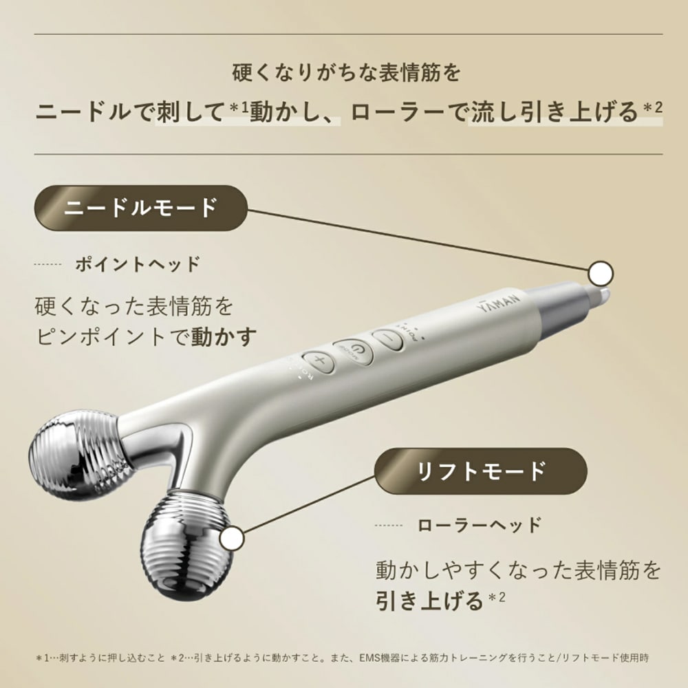 こわばった表情筋をピンポイントで動かす「ニードルモード」と、動かしやすくなった表情筋を引き上げる(※2)「リフトモード」を搭載。