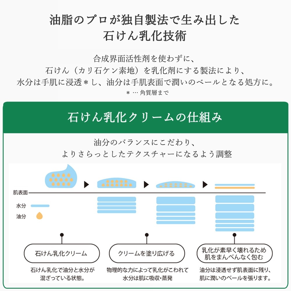 また独自製法で生み出した石けん乳化技術により、水分は角質層に浸透し、油分は手肌でうるおいベールを形成。