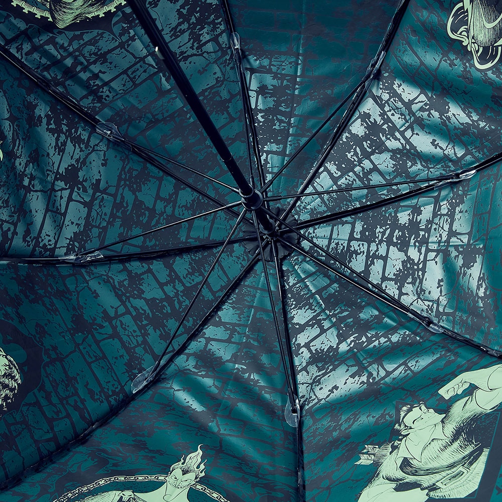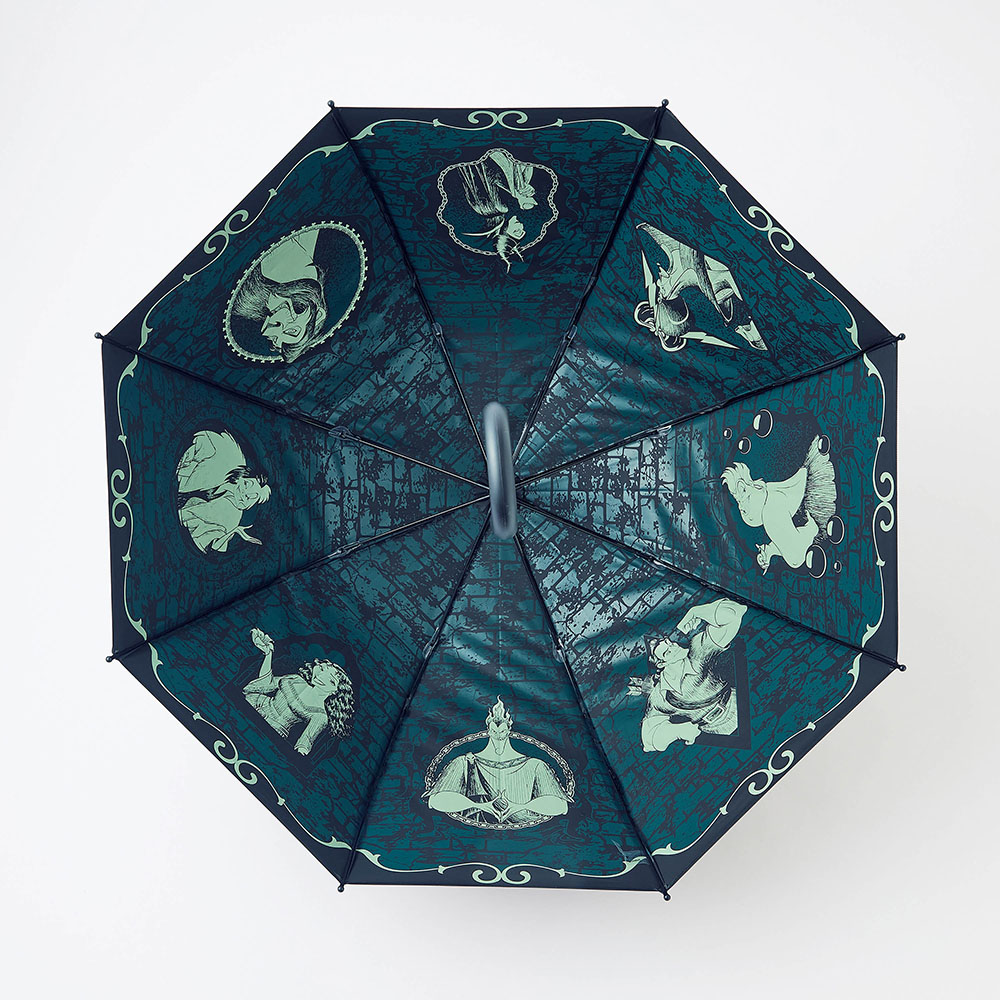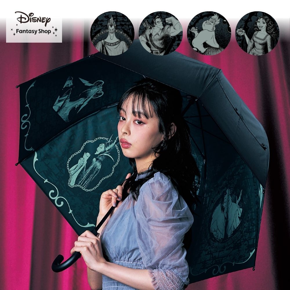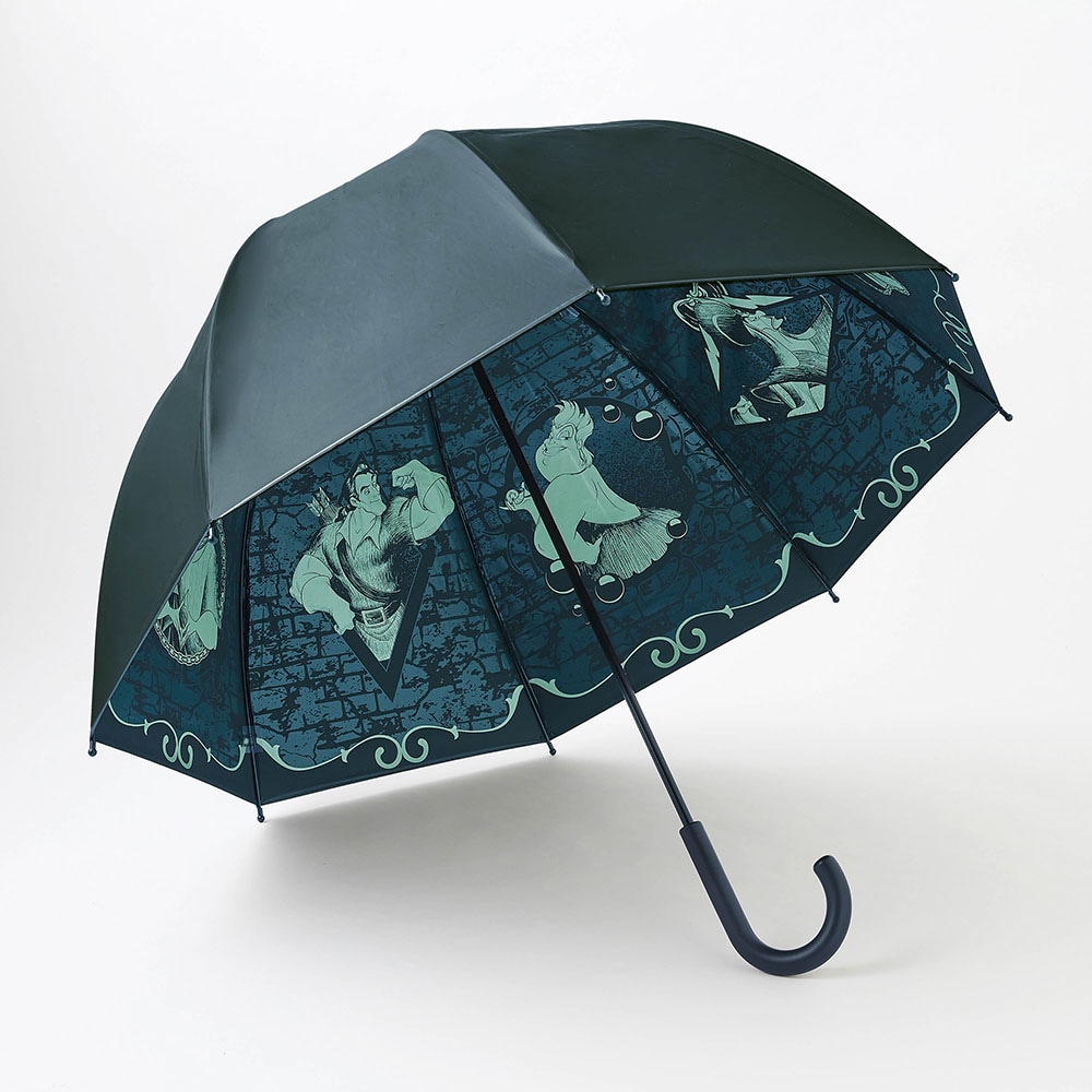 ヴィラン集結のこの傘、ほぼ即買いしてしまいました。内側はもちろん図柄で満たされているのですが、畳むと柄から先まですべてが真っ黒で無地なので、男性の持つ傘と間違って持って行かれそうです。柄のところに何か明るい目印をつけないと、と思いました。あと、UVカットということで晴雨兼用なのでしょうが、ビニール素材でしかも真っ黒なので、なんとなく日傘として使うのはどうなんだろう?という感じです。黒色でも日傘と言うのはどこか素材とか柄に軽やかさがあるものなので…。あと開いたときのこの匂いはなんとかならないものか?使っていれば消えるのでしょうか?思っていたほど出番はないかもですが、ヴィランが好きなので手元には置いておきます。