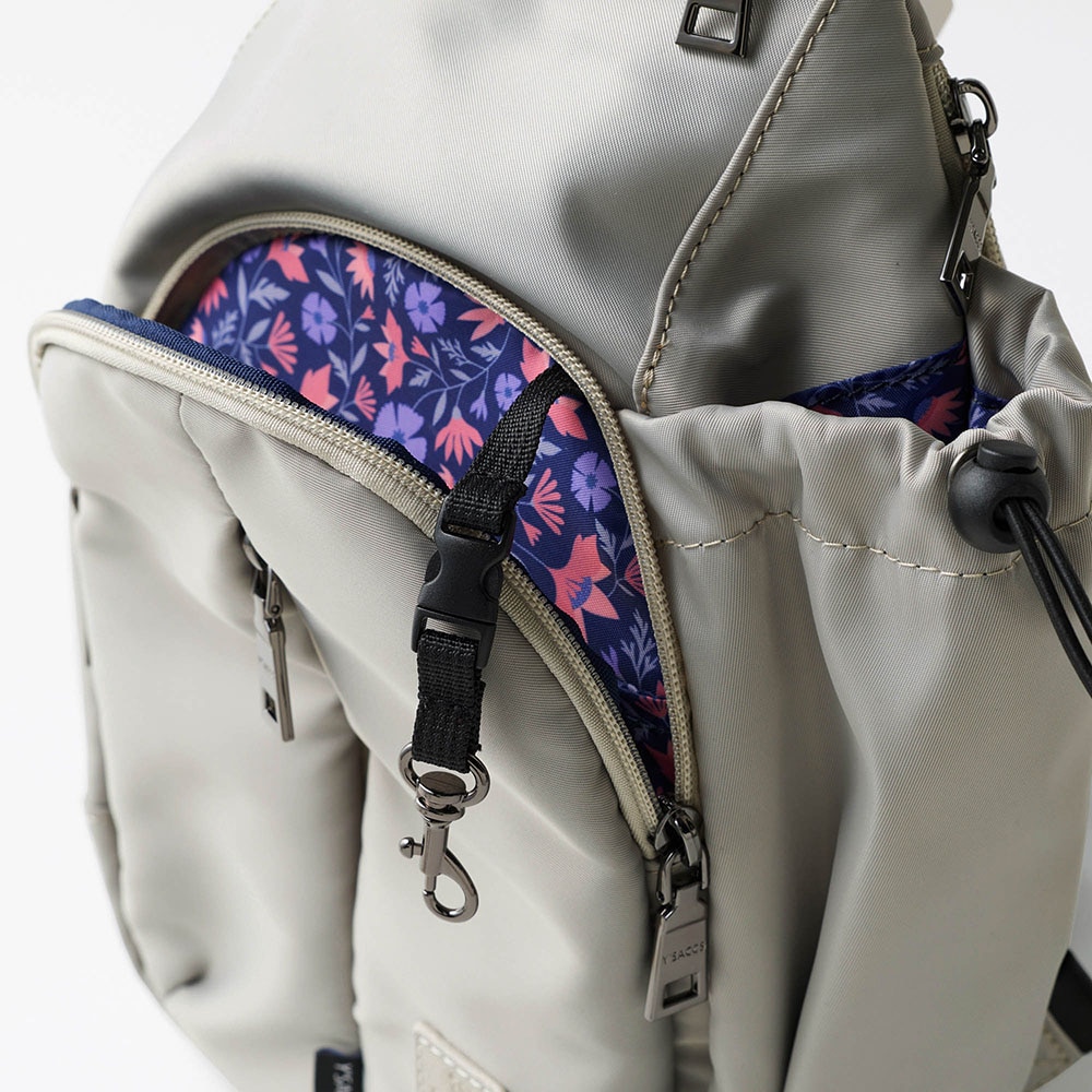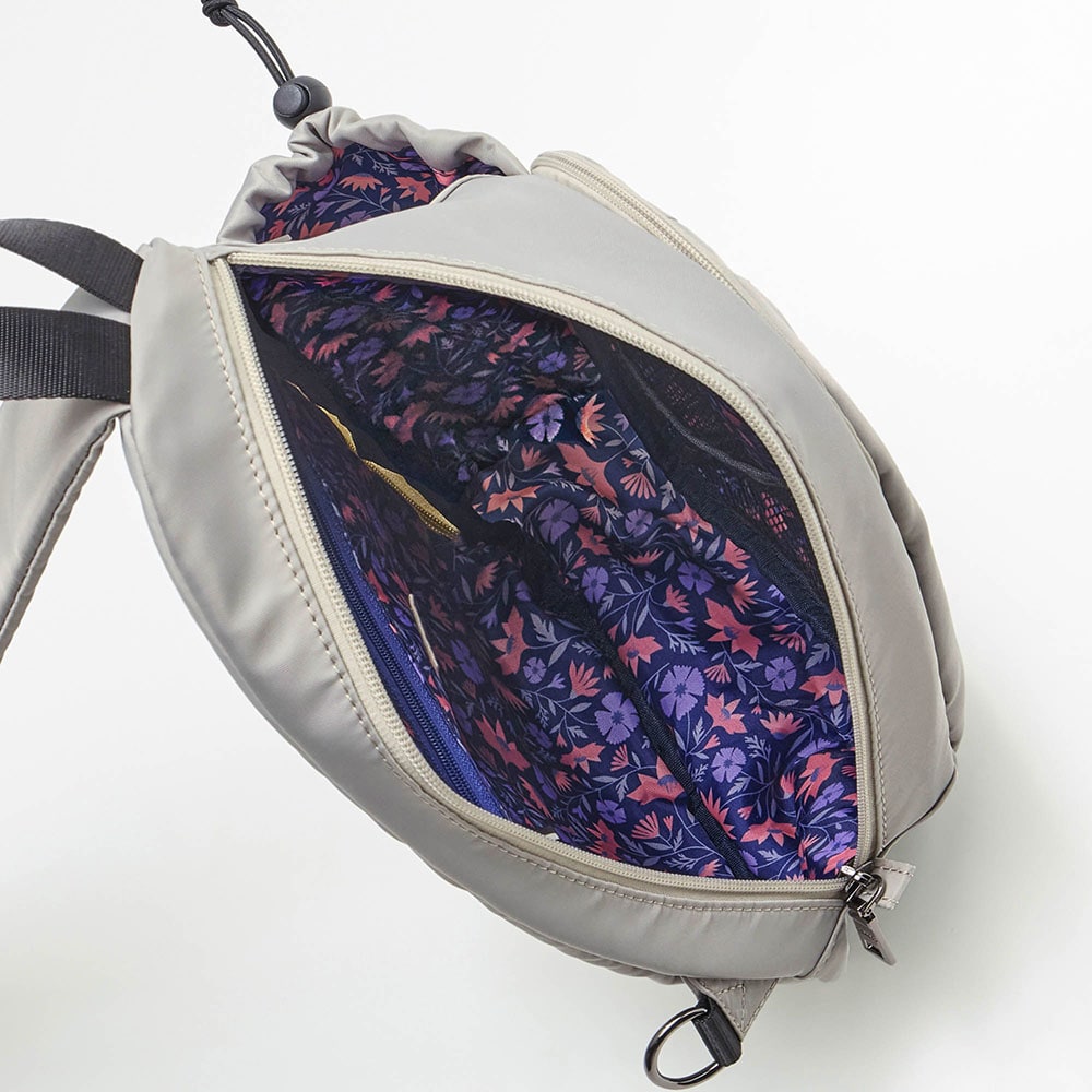 ●ポケット:中にオープン1つ・ファスナー付き1つ、外にファスナー付き2つ(前ファスナーポケットの中にオープン1つ・キーフック1つ【取り外し可】)・ドローストリングポケット1つ