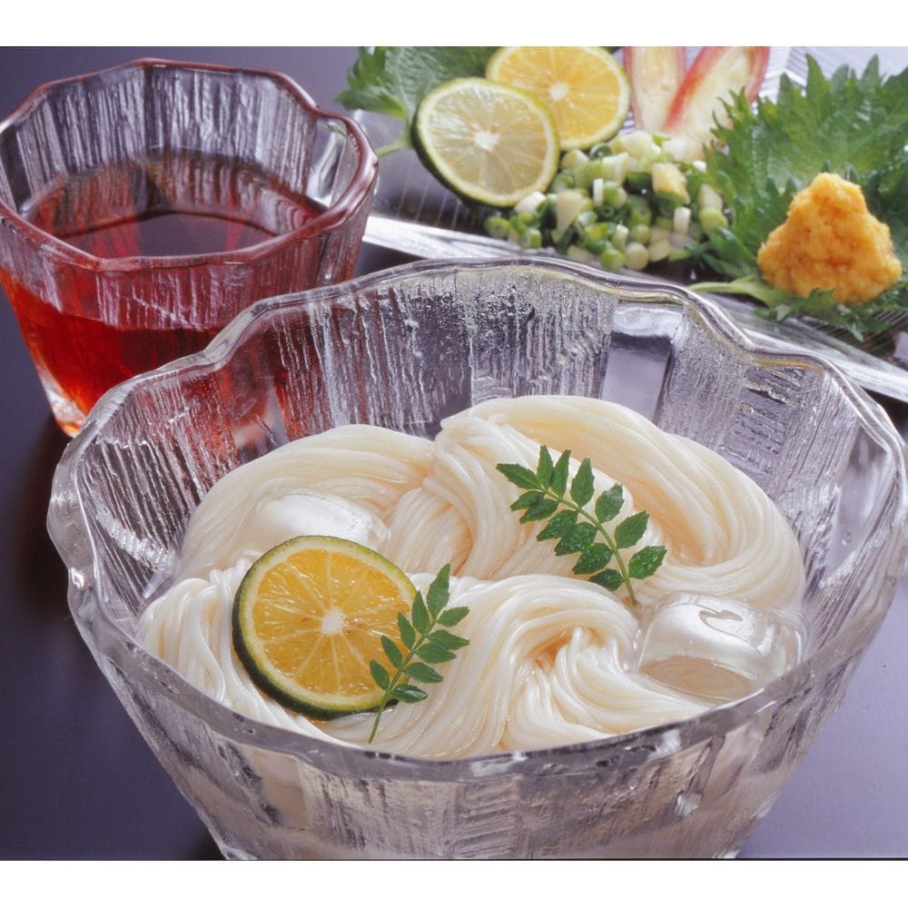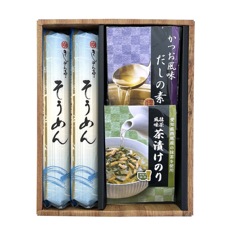 長い時間をかけて乾燥させることにより、のど越が良く、もっちりした麺に仕上げましたそうめんと、だしの素、にゅうめんにも使えるお茶漬けの素の詰合せです。