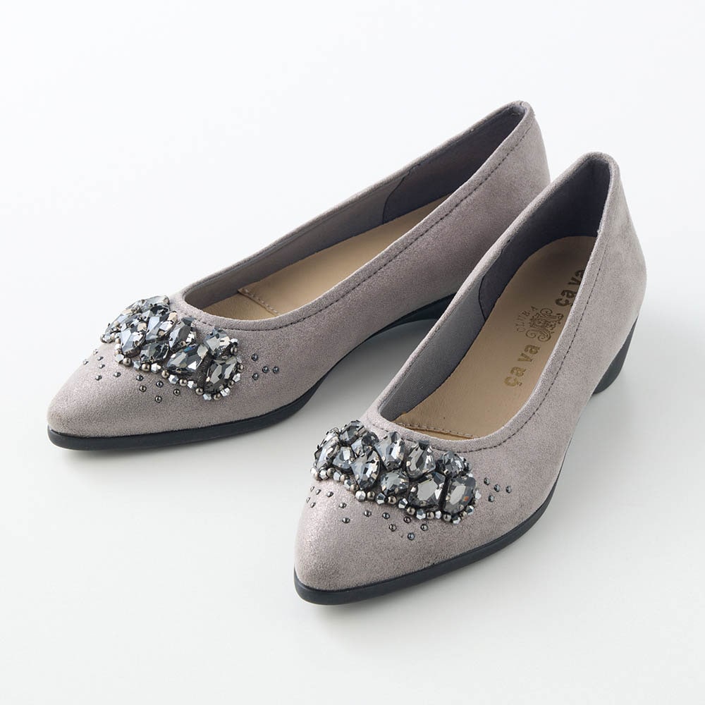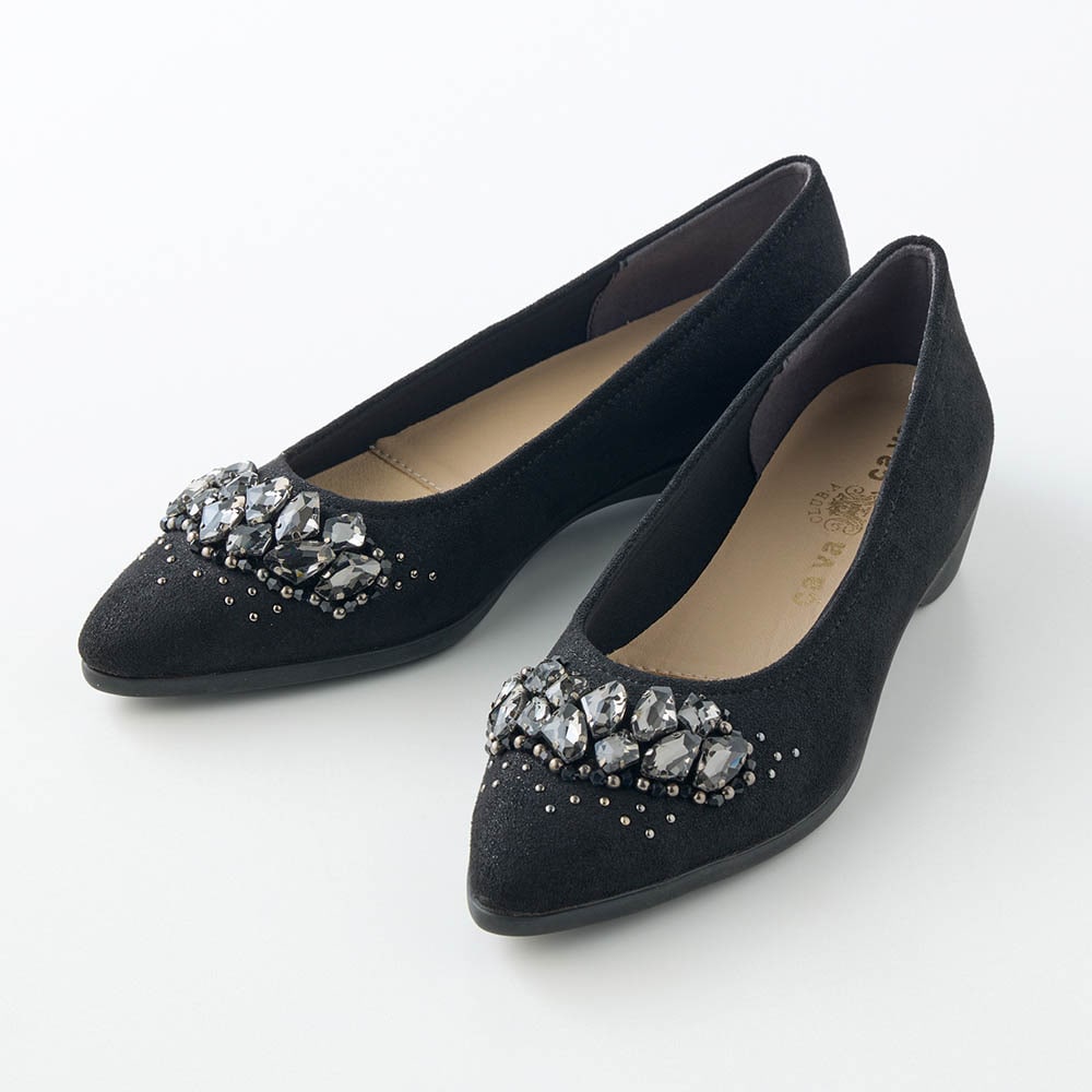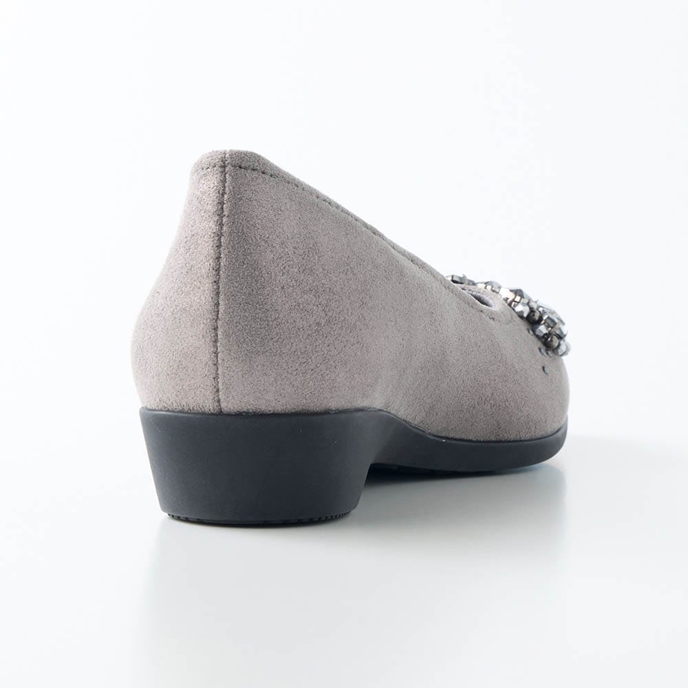 ビジューは左右対称についているものだと思っていましたが、この靴は左右同じ並び、つまり右の靴の親指側から小指側に配置されているビジューが左の靴は小指側から親指側に向かって配置されています。靴を履いて足をそろえて真上から見ると親指付近のビジューの大きさや空間が違っているのが分かります。