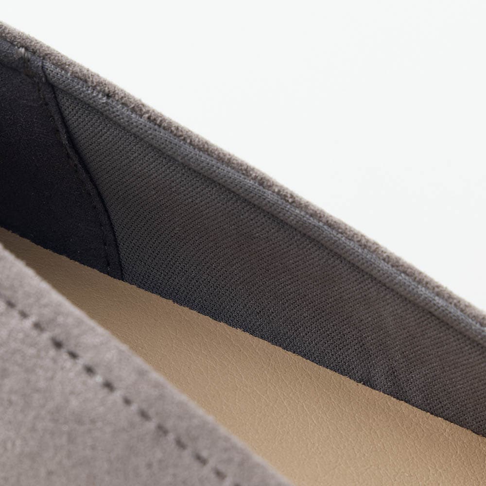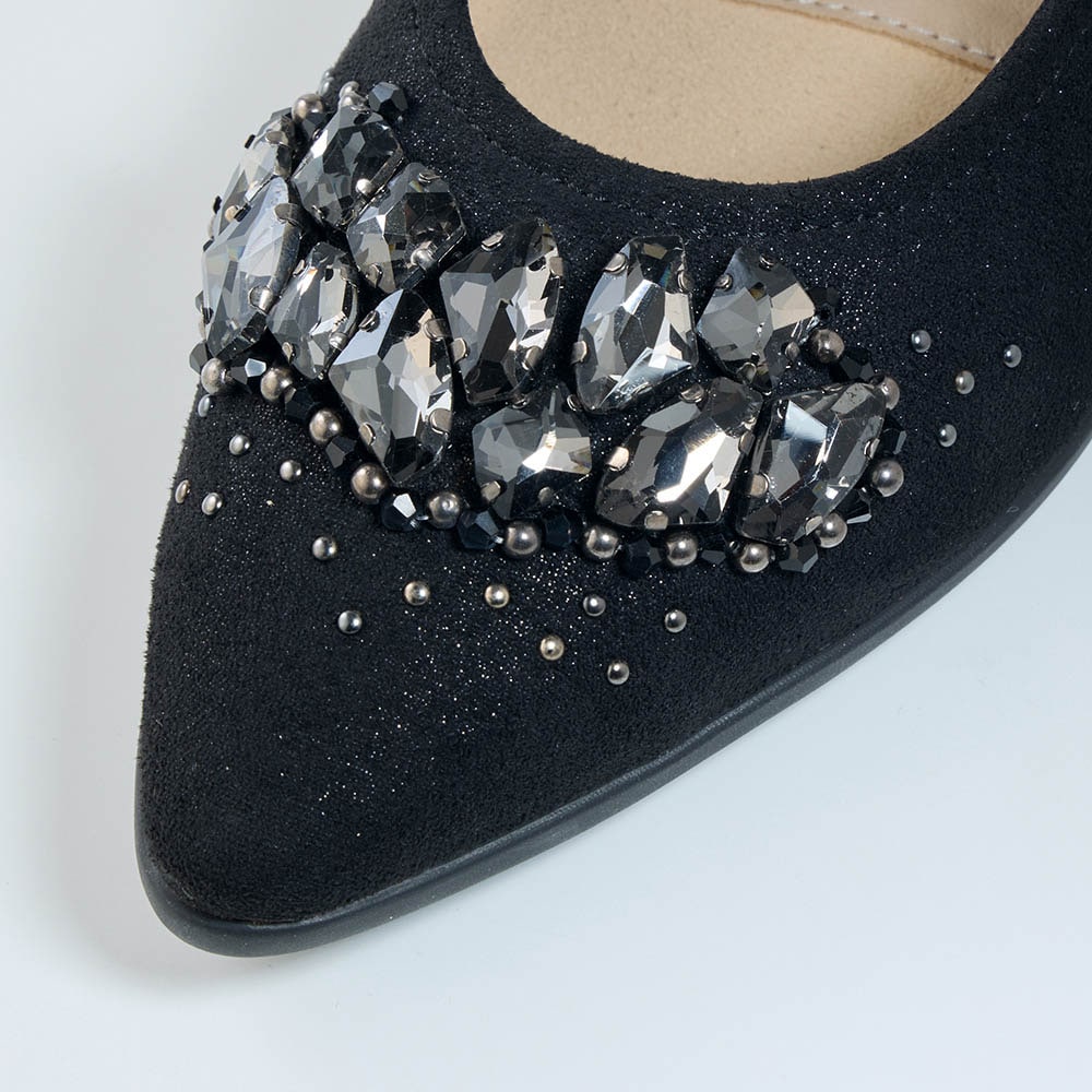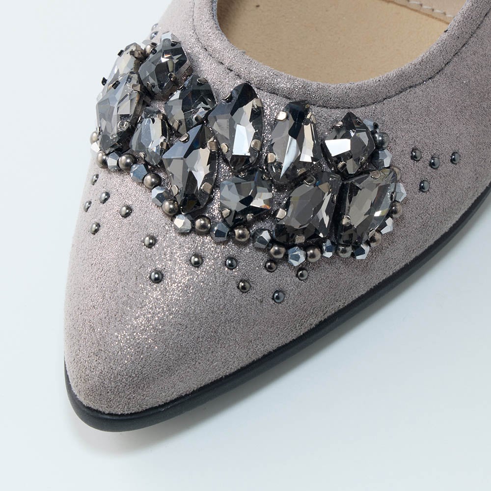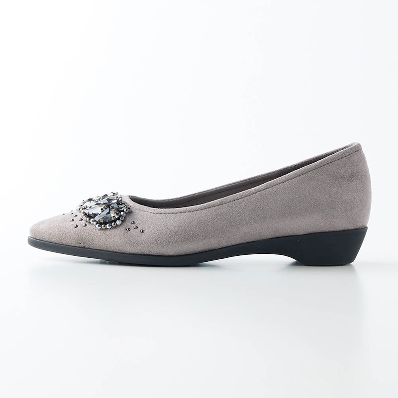 ビジューは左右対称についているものだと思っていましたが、この靴は左右同じ並び、つまり右の靴の親指側から小指側に配置されているビジューが左の靴は小指側から親指側に向かって配置されています。靴を履いて足をそろえて真上から見ると親指付近のビジューの大きさや空間が違っているのが分かります。