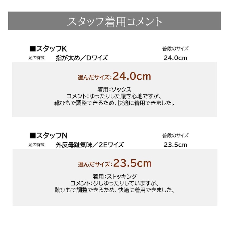 普段のサイズ通り、あまり厚みのないソックス着用で、小指に痛みや変形の無い3Eの人向き、糸が解れてるしコバ口が目立つのを気にしない人向きです。