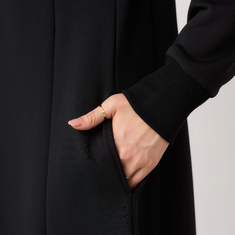 届いて箱から出した瞬間は生地が重いもと感じましたが、着ると不思議とそんなに重さを感じず、しかも切り替えラインが縦に入っていて、ぽっちゃりの私でもスッキリ見えました! 黒ですが心配していたホコリもそんなにくっつかず、温かくて色違いの購入も検討したいと思います。