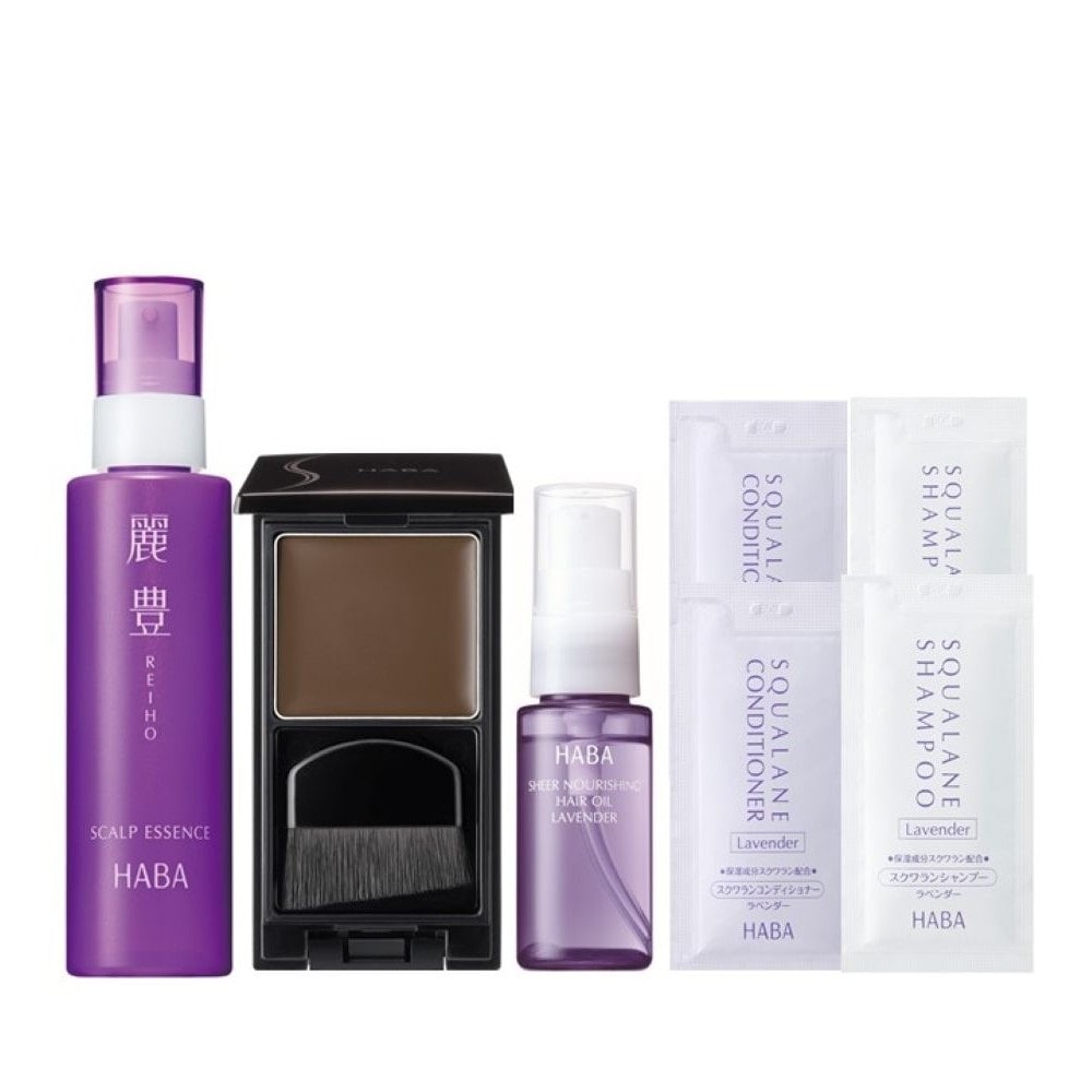●セット内容/薬用麗豊(医薬部外品)120ml、白髪カバーファンデーション、さらさらしっとりヘアオイル(ラベンダー)28ml、スクワランシャンプー(ラベンダー)/パウチ×2、スクワランコンデショナー(ラベンダー)/パウチ×2