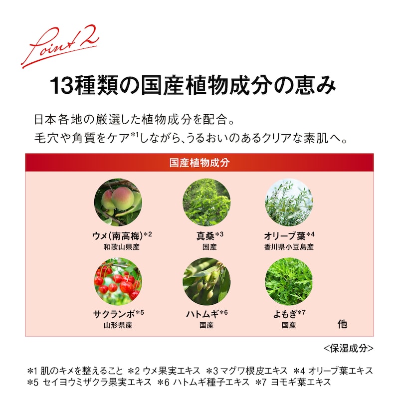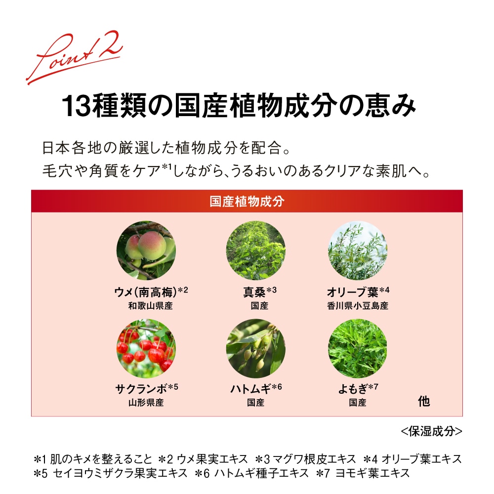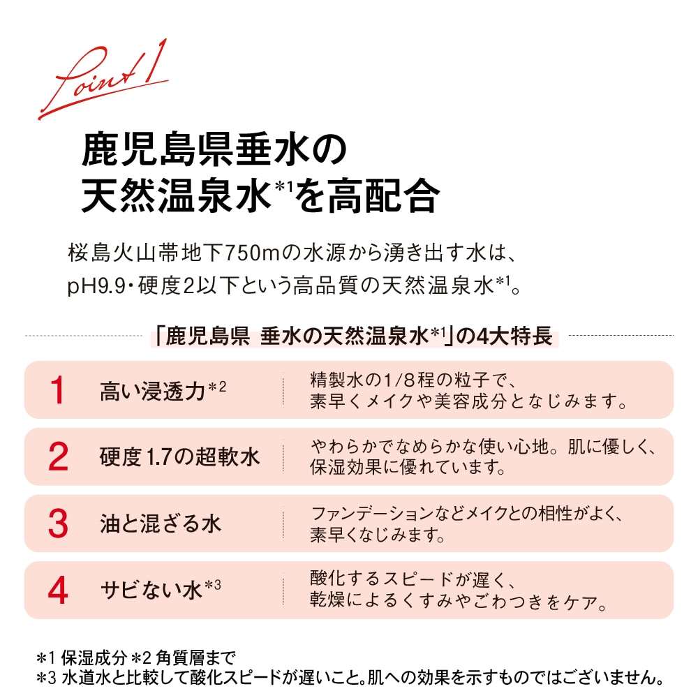 鹿児島県・垂水の大地が育んだ澄み渡るようにやわらかな天然温泉水(保湿成分)をベースに、13種類の厳選国産植物成分を配合。