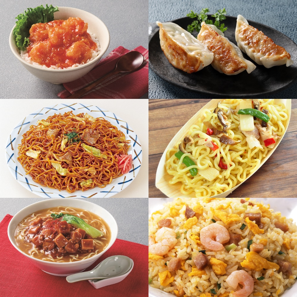 ●焼かずにできる!焼き餃子(10個入)、まちのソース焼そば(250g)、麻婆豆腐(180g)、えびチリ(150g)、海老入り炒飯(250g)、上海風塩焼そば(200g)×各1(計6種)